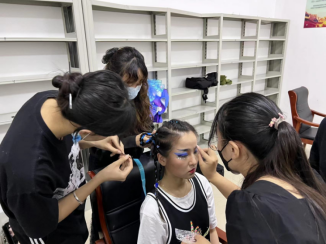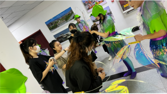 9月9日,产教融合青岛基地组织校本部应用设计学院和产教融合青岛基地的妆扮设计专业学生前往西海岸新区隐珠文化艺术中心,在教师曹灿的带领下,进行舞台艺术化妆的实践教学。
