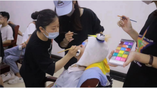 为使教学实践顺利开展,课程前期,任课教师带领学生进行了资料收集和剧本分析,根据剧情中的人物设定,设计人物化妆造型和头饰。在课堂中,充足练习、打磨化妆技法。在西海岸新区隐珠文化艺术中心剧场,由曹灿老师指导,师生协同完成化妆造型和执行工作,用画笔在演员的脸上勾勒出优美的线条,进行细致的抹粉定型,呈现出一幅幅生动的面孔。