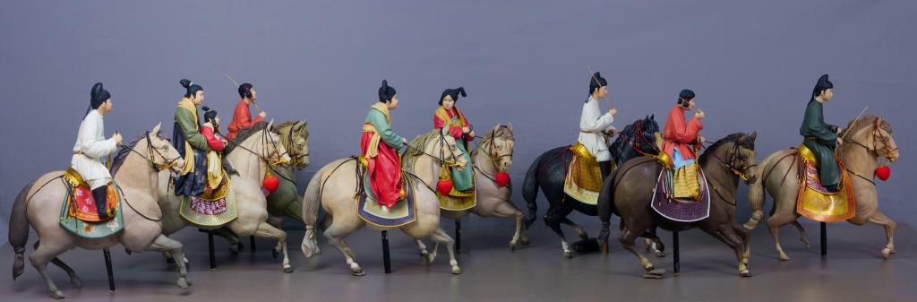目前已完成的系列作品有《韩熙载夜宴图》、《虢国夫人游春图》、《捣练图》、《挥扇侍女图》、《簪花仕女图》、《宫乐图》、《听琴图》、《文苑图》等,这些作品中人物形象塑造的饱满精致,表情惟妙惟肖,栩栩如生。