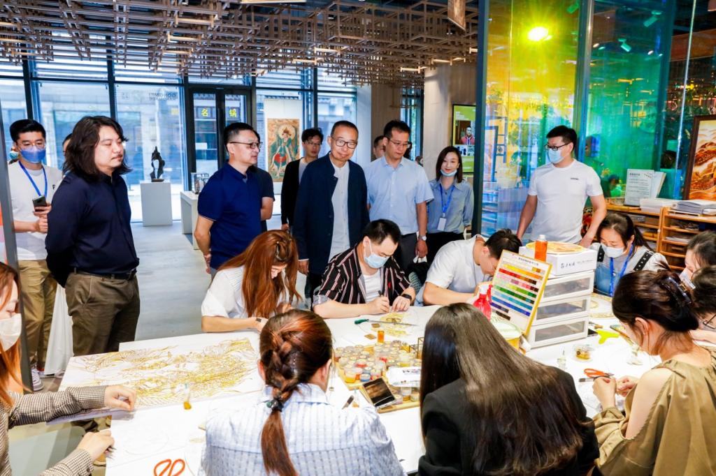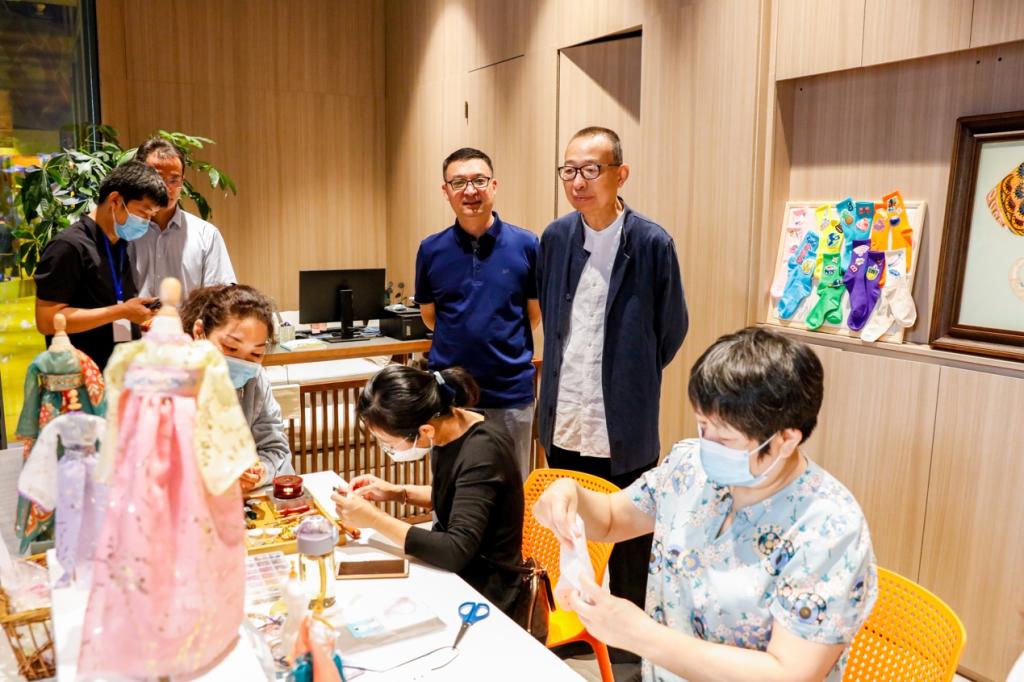 9月22日,院长潘鲁生在“山东手造”(济南)展示体验中心检查指导学校“工美手造”设计师品牌店与“山东手造”创意研发中心工作。党委委员、党委宣传部部长韩文涛,“山东手造”(济南)展示体验中心运营主体单位——济南明府城文旅投资控股有限公司总经理卞华梁陪同检查。