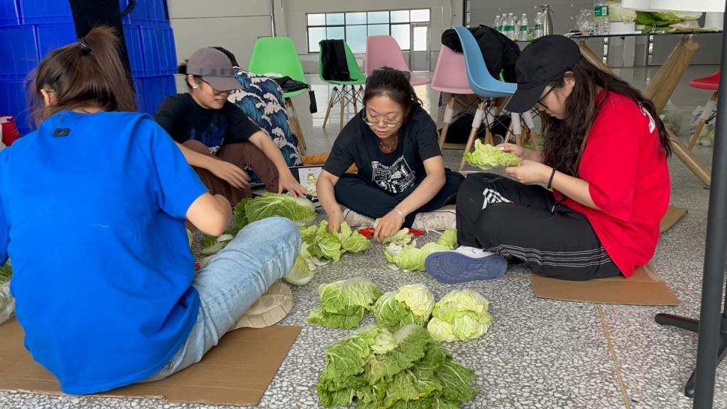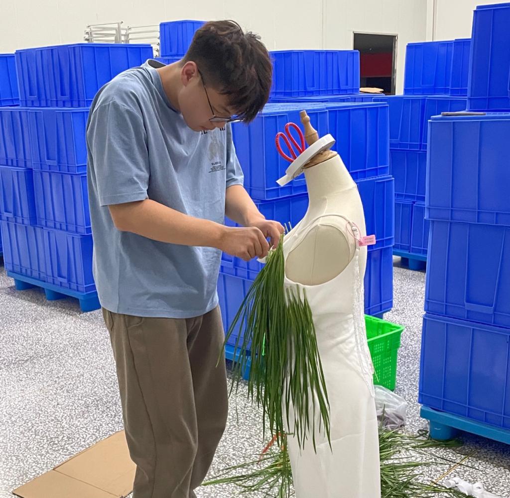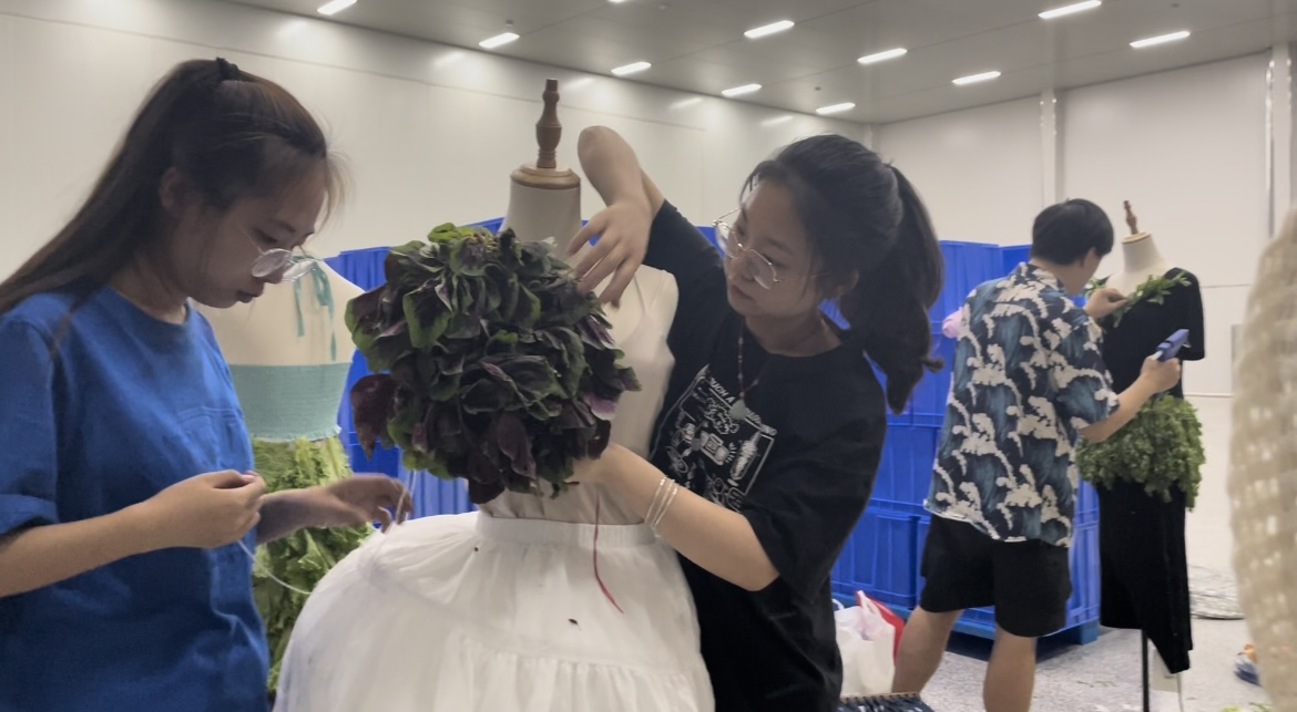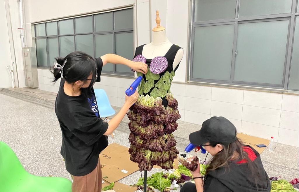 本次实践服务团队由服装学院教师滕汶臻带队,7名服装设计学生参与。制作过程中,师生们根据服装效果图将所需的蔬菜进行分类整理,然后以服装效果图为标准进行服装制作,在不断的组合尝试中,用时四天共完成了30套蔬菜服装设计,是学校利用专业优势积极探索助力乡村振兴的新模式。