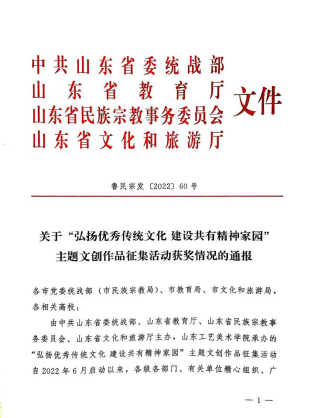 近日,中共山东省委统战部、山东省教育厅、山东省民族宗教事务委员会、山东省文化和旅游厅联合印发文件,对“弘扬优秀传统文化 建设共有精神家园”主题文创作品征集活动的获奖情况进行通报,永利官网师生荣获文创产品类金奖1个、银奖2个、铜奖2个、优秀奖4个,视觉设计类金奖1个、银奖2个、铜奖4个、优秀奖13个,6位教师获得优秀指导奖,学校获得优秀组织奖。