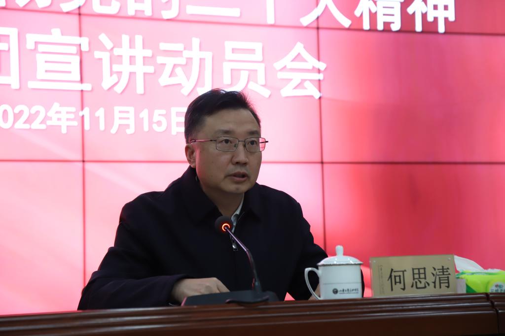 何思清就做好学校党的二十大精神宣讲工作提出要求。一是要深刻认识党的二十大的重要意义,提高政治站位,以高度的政治责任感和历史使命感肩负起集中宣讲的光荣使命,让宣讲工作“热起来”。二是要全面准确深入宣讲党的二十大精神,牢牢把握正确导向,坚持全面学习、准确领会、精准解读,让宣讲工作“深下去”。三是要切实增强宣讲的针对性和有效性,分层次、一体化推进,实现宣讲全覆盖,扩大宣讲影响力,让宣讲工作“活起来”。四是要扎扎实实做好宣传宣讲工作,突出重点、抓住关键、迅速行动,以讲入心、以讲促研、以讲笃行,让宣讲工作“实起来”。