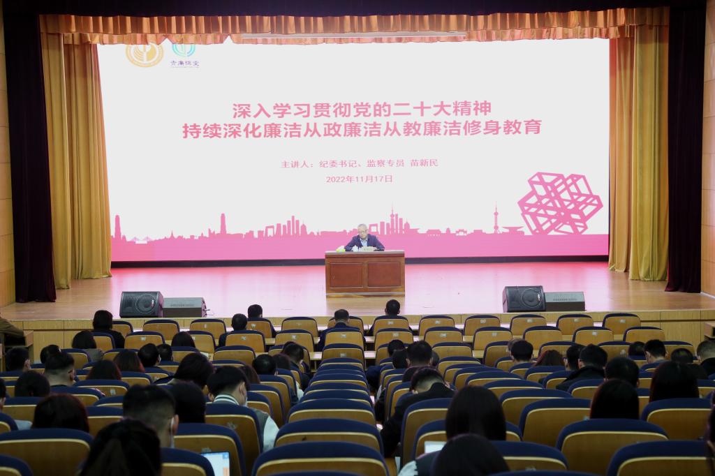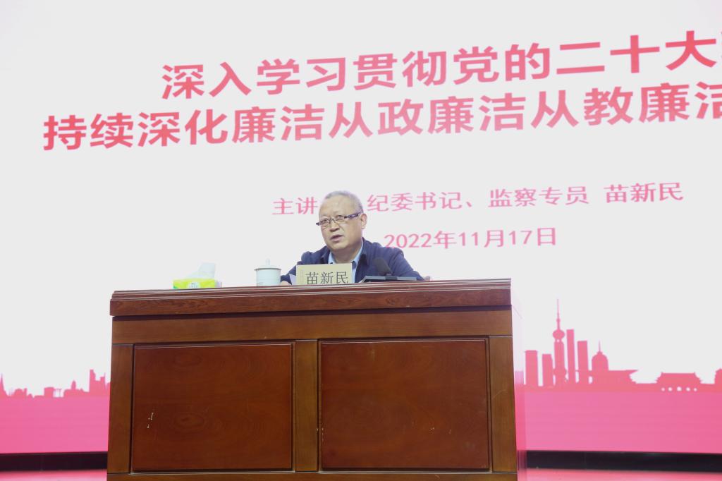根据省纪委监委关于对年轻干部、新入职教师、新发展青年党员和应届毕业生等群体开展廉洁教育工作部署和学校党委学习宣传贯彻党的二十大精神要求,11月17日下午,学校在长清校区学术报告厅举办“青廉课堂”。学校党委委员、纪委书记、监察专员苗新民作了题为《深入学习贯彻党的二十大精神持续深化廉洁从政廉洁从教廉洁修身教育》的专题报告。学校新提拔干部、新进教师、学生党员代表和党委组织部、宣传部及各党总支负责同志参加报告会。