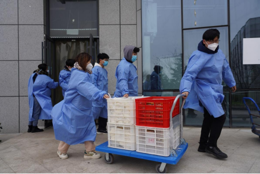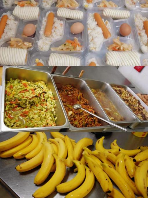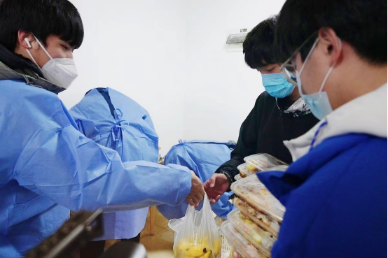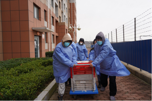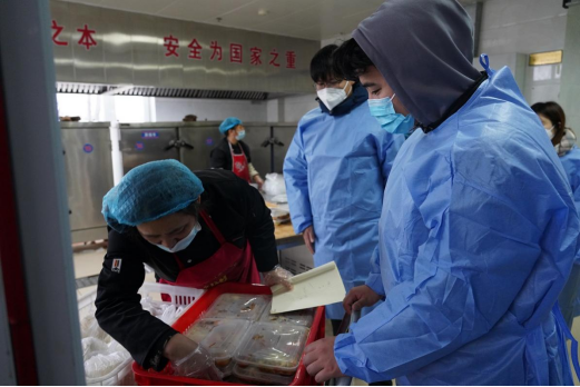 适逢青岛大风降温天气,寒冷的气候并没有减退老师和志愿者们的热情,他们总是在第一时间到餐厅取餐,分批运送到宿舍楼后,迅速分工、分发饭菜,等全部工作结束后,他们才能吃上一口饭。对于少数民族同学的就餐问题,进行单独沟通、单独制作、单独派发,保证每一位同学都能吃到可口的饭菜。