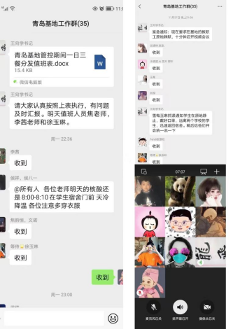27日晚,青岛基地管委会迅速组织全体教师召开线上会议,启动疫情防控管理应急模式,在疫情形势未确定前,务必率先确保学生的身心健康,把学生的安全放在第一位。教学业务办公室积极协调,开启线上教学模式,确保日常教学工作正常运转。辅导员老师下沉一线,做好解释通知和安抚工作。疫情防控小组制定暖心送餐服务计划和具体实施方案,并与园区餐厅进行沟通,准备随时开启送餐服务。
