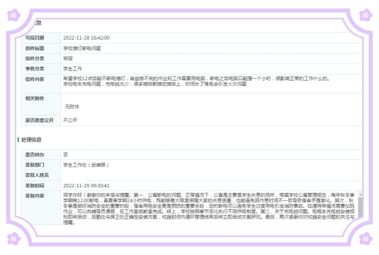 2022年11月26日,“工美12345”正式上线。通过“你反映,我来办”的形式,努力打造线上反映、线下办理的师生诉求快速办理通道,让师生表达、师生参与、师生监督的途径和渠道等更加顺畅、更为有力。上线一周以来,共受理各类师生群众反映事项百余件,对于师生员工提出的咨询建议和投诉事项,学校相关部门一站式快速办理,结果可查询、可评价、可督办、可考核,架起了一座紧密联系师生的“同心桥”。