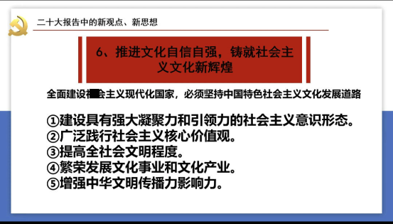 邢凯以《学习贯彻党的二十大精神》为主题,重点从“二十大报告的基本内容”和“二十大报告中的新观点、新思想”两个方面展开宣讲。围绕“党的二十大报告的基本框架、主要内容、大会主题”等内容进行深入讲解,结合习近平总书记提出的“五个牢牢把握”,深入分析自党的十二大以来历次大会的报告题目和深刻内涵,从而全面认识大会主题的伟大意义。在解读二十大报告中的新观点、新思想时,着重从“十年来的‘三件大事’,‘三个务必’,跳出历史周期率的第二个答案,中国式现代化的五个特色,全面建设社会主义现代化国家的基础性、战略性支撑,推进文化自信自强、铸就社会主义文化新辉煌”六个方面进行讲解,并从脱贫攻坚、科研教育的发展等方面列举我们国家发展壮大的伟大历程。讲座最后,邢凯提出“思政与艺术的思考”观点,讲述在艺术创作中,如何探索、挖掘作品背后的红色故事和红色力量,开创艺术和思政相结合的新模式。