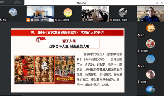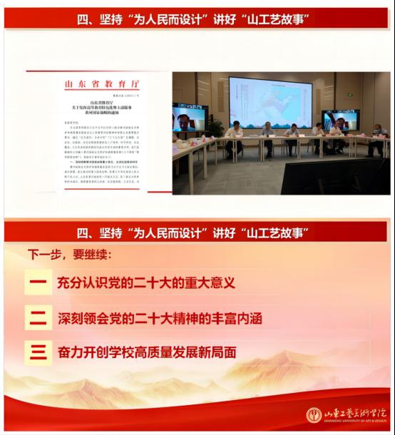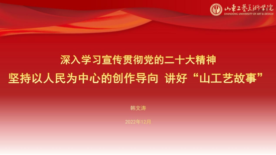 韩文涛以《深入学习宣传贯彻党的二十大精神:坚持以人民为中心的创作导向讲好“山工艺故事”》为题,从文艺的“人民性”释义展开讲解,系统梳理了习近平总书记关于“坚持以人民为中心的创作导向”的重要论述,图文并茂地展示了新时代我国文艺发展取得的重大成就、书写的生生不息的人民史诗,深入诠释了学校坚持“为人民而设计”的办学理念。