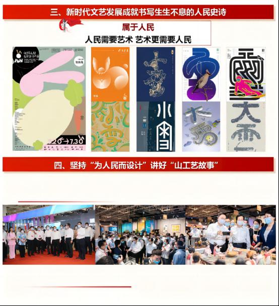韩文涛结合学校近几年开展的“培育和践行社会主义核心价值观”“生命重于泰山”各级各类主题创作成果,承担的“山东手造”推进工程、“文化体验廊道”建设等工作任务,生动阐释了“设计源于人民”“设计为了人民”“设计属于人民”的深刻内涵。