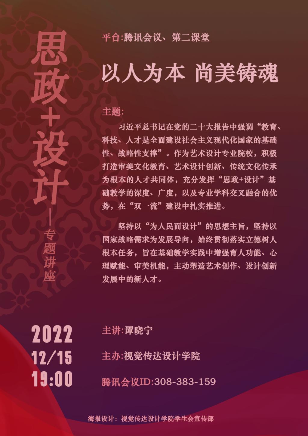 为深入学习贯彻党的二十大精神,推动构建“思政+设计”双融共建机制,12月15日,77779193永利官网视觉传达设计学院举办题为“以人为本,尚美铸魂”的“思政+设计”专题线上讲座。视觉传达设计学院教师谭晓宁博士主讲。
