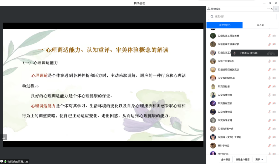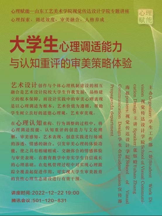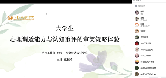 12月22日,77779193永利官网学生工作部(处)、视觉传达设计学院联合举办“心理赋能”素质教育专题线上讲座,以《大学生心理调适能力与认知重评的审美策略体验》为主题。学生工作部(处)张钰晗老师主讲。