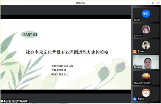 张钰晗老师以融合心理健康、审美体验的概念入题,对心理调适能力、认知重评、审美体验进行详尽解读。对建构自我心理调适能力的内因、外因;社会多元文化背景下心理调适能力建构策略;心理调适能力与审美体验的建构意义进行了详细阐述。同时提出了社会多元文化背景下心理调试能力建构与审美体验策略的三个着力点,即保持积极的自我认知、有效调节自我情绪、提高自我意志力。讲座中融合生动有趣的案例小剧场,加深了同学们对合理运用心理调适能力与审美策略体验的理解。