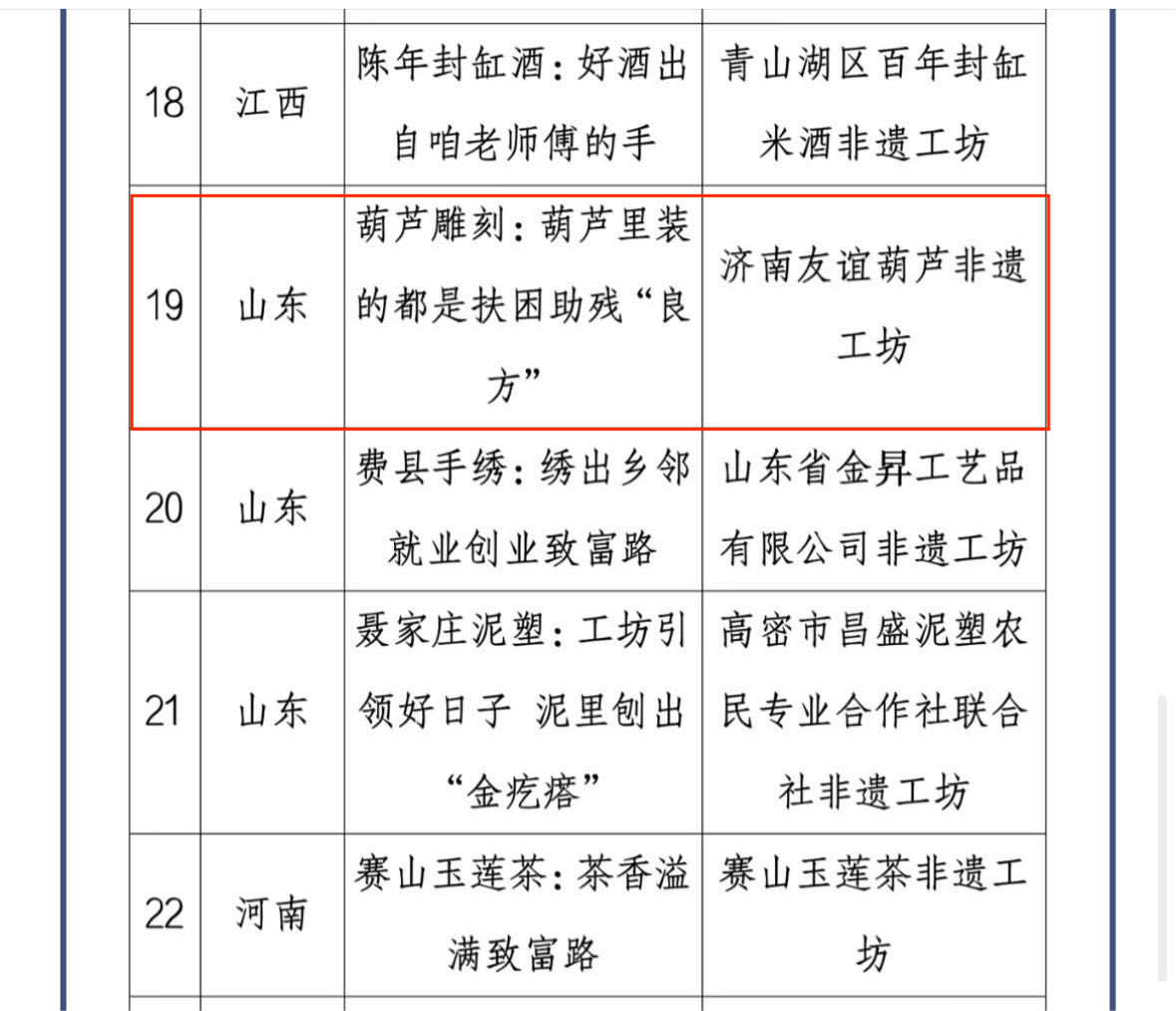 近日,文化和旅游部、人力资源社会保障部、国家乡村振兴局联合发布《关于公布2022年“非遗工坊典型案例”的通知》,永利官网非遗研培工作站——济南友谊葫芦非遗工坊入选2022年“非遗工坊典型案例”。