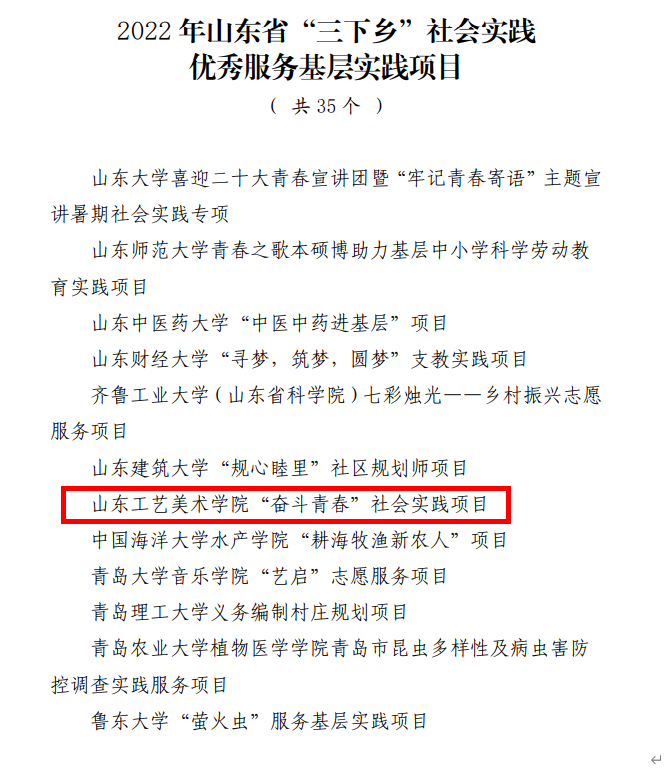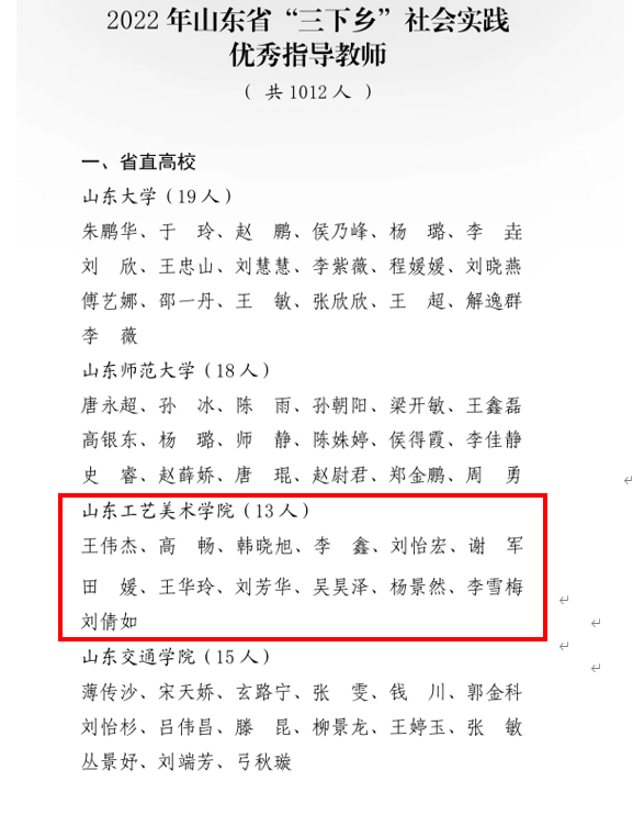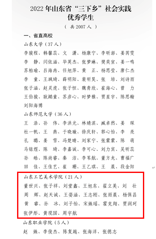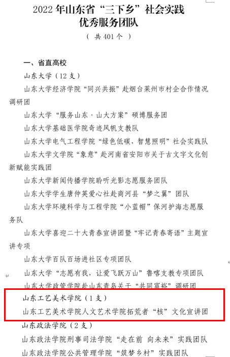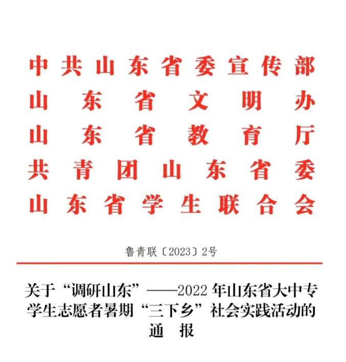 近期,中共山东省委宣传部、山东省文明办、山东省教育厅、共青团山东省委、山东省学生联合会发布《关于“调研山东”——2022年山东省大中专学生志愿者暑期“三下乡”社会实践活动的通报》,永利官网喜获39项集体和个人表彰荣誉,其中“优秀指导教师”13人、“优秀学生”21人、“优秀服务团队”1个、“优秀基层实践项目”1个、“优秀调研报告”2篇,学校获评“优秀组织单位”。