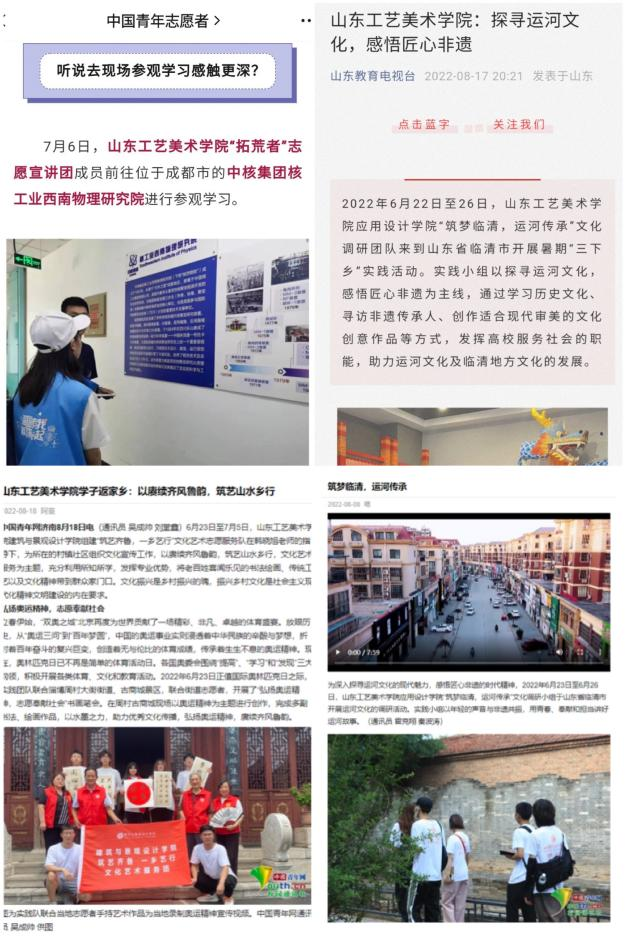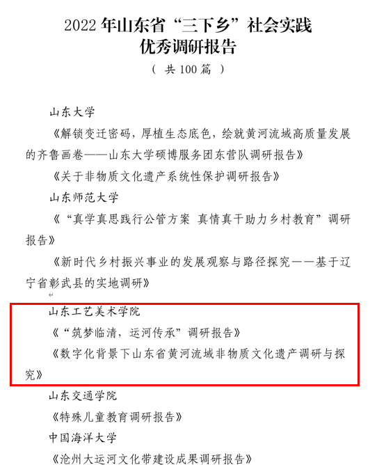 本次社会实践集中组队104支,组织发动155个团支部、4000余名团员青年参加,覆盖山东、江苏、安徽等20余省市地区,累计服务群众达80000余人,实践成果受到国家级媒体宣传报道25次、省级及其它媒体宣传报道40余次,实践育人成果显著,得到了社会的广泛认可和关注。经过组织申报、审核把关、综合评议等环节,最终永利官网王伟杰等13名老师获评2022年全省大中专学生志愿者暑期“三下乡”社会实践活动“优秀指导老师”,董世兴等21名同学获评“优秀学生”,人文艺术学院拓荒者“核”文化宣讲团获评“优秀服务团队”,造型艺术学院“奋斗青春”社会实践项目获评“优秀基层实践项目”,应用设计学院《“筑梦临清,运河传承”调研报告》、造型艺术学院《数字化背景下山东省黄河流域非物质文化遗产调研与探究》获评“优秀调研报告”,学校获评“优秀组织单位”。