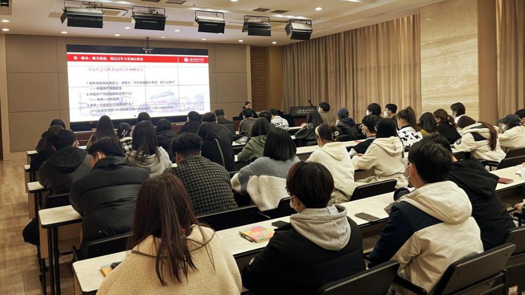 开班仪式结束后,学校党的二十大精神宣讲团成员、马克思主义学院教师钟晓雅以“以青春之我,铸复兴强国”为题进行首场培训。钟晓雅从“雄关漫道,铭记百年大党的初心使命”“人间正道,领航中华民族复兴伟业”“长风破浪,筑梦青春共赴强国之约”三个发面进行展开讲解,结合学校办学理念、培养方向和优秀校友事迹,呼吁同学们做有理想、有担当、守匠心、会思考、肯奋斗的新时代青年。