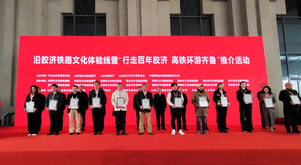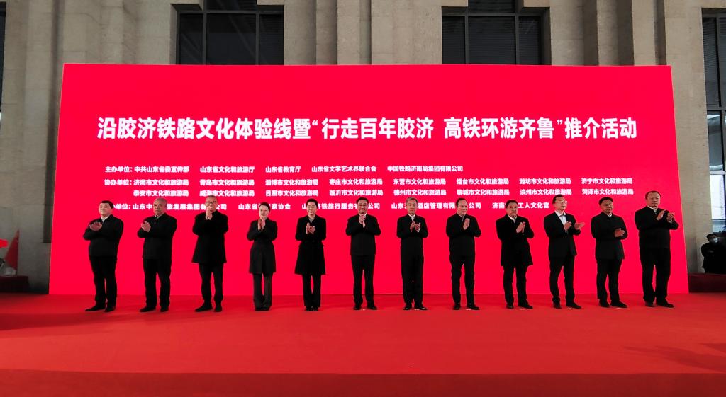 3月16日,由中共山东省委宣传部、山东省文化和旅游厅、山东省教育厅、山东省文学艺术届联合会、中国铁路济南局集团有限公司共同主办的“沿胶济铁路文化体验线”暨“行走百年胶济、高铁环游齐鲁”宣传推介活动在济南西站举行。山东省委常委、宣传部部长白玉刚,国铁集团宣传部部长宋强太,省委宣传部分管日常工作的副部长、省文明办主任、省新闻办主任袭艳春,省委宣传部副部长、省电影局局长程守田,省文旅厅厅长王磊,省教育厅副厅长仲红波,省文联党组书记何思清,省文联副主席矫红,中共济南市委常委、宣传部长戴龙成,国铁济南局党委书记、董事长王新春,国铁济南局总经理贯昌奉出席活动开幕式。