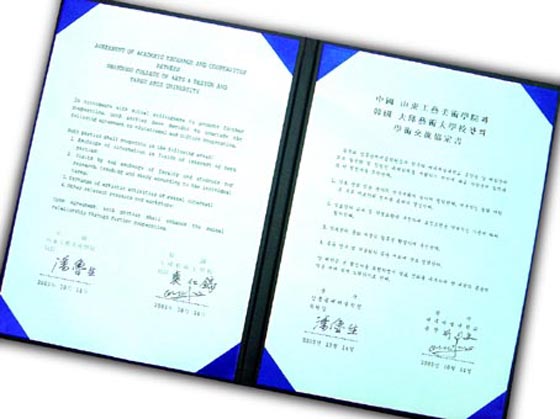 潘鲁生院长与裴仁镐校长在双方学术交流与合作协议书上签字。今后双方将在互惠的前提下交流信息;根据各自的研究课题互派教师访学和学生留学;举办相关的艺术活动以及其他课题研究和作品展览。在这个协议的基础上,双方将通过进一步的合作增进友谊。潘院长邀请裴校长在明年到我院访问,裴校长愉快接受了邀请。