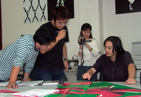 陈:比如中国书法中的宋体,以及书法形式的其他种类,从中找到一些自己感觉的东西,重新演绎它!使它成为新的东西!比如说通过变形,但就在这个过程中,你的建议和我的建议是不一样的,可能你的东西比我的东西更新,但我是提倡这种新的方法,新的尝试的,涉及到制作材料、工艺上也要讲究。