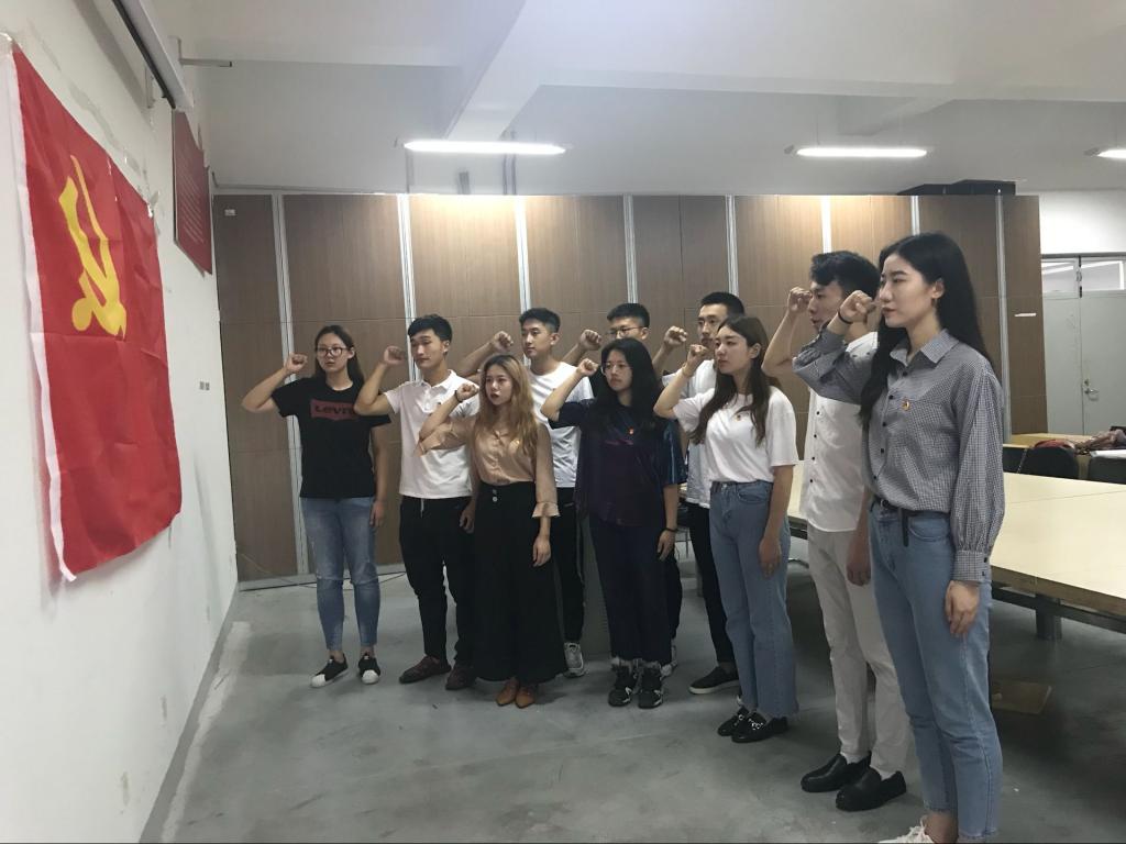 接着,10名新党员佩戴党徽,举起右拳,面对党旗庄严宣誓。