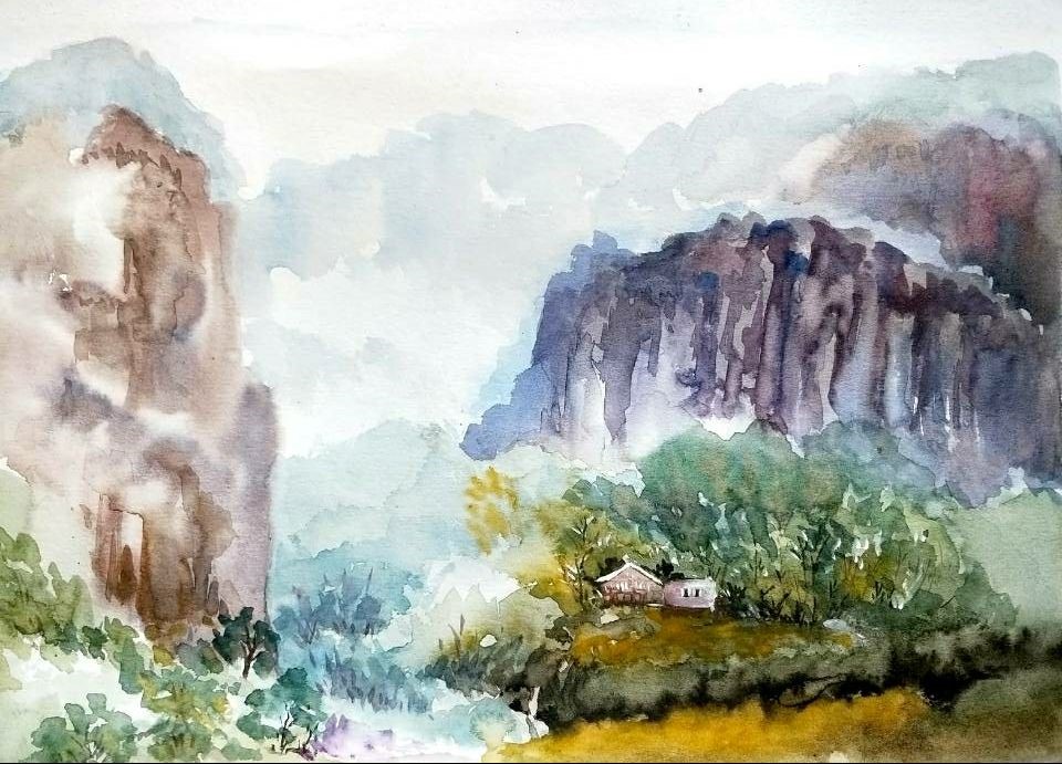 2017级视觉传达四班的赵艺筱同学与大家分享到:“这一幅画源于太行山写生的感受,首先是我看了一个水彩大师的作品,突然感觉水可以直接一次性将颜色发挥出不同的感受,所以我就尝试以水不同时期不同感觉修改的方式直接画山水。没有那么高的水准,但是有了新的探索。”