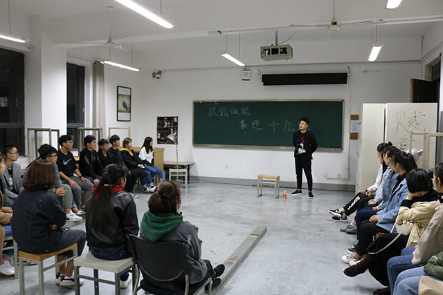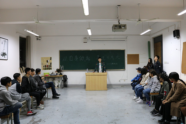 为迎接党的十九大召开,10月11日晚,视觉传达设计学院组织学生在各班级教室召开“从自我做起,喜迎十九大”主题班会。学生党员身体力行践行“两学一做”要求,按照学院学生党员“三个一”活动安排,深入联系班级,结合喜迎十九大相关内容,开展教育宣讲工作。