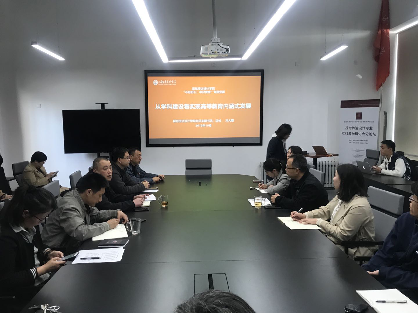孙大刚院长结合学院积极参与山东省一流学科前期申报及建设的经验,通过近年来对学科和学位点建设如何适应时代变革和社会发展需要,以及优化学科建设、实现视觉传达专业教育内涵式发展的思考。指出当前学院存在:高层次成果、项目及获奖数量少;师资方面具有博士学位少;高层次教科研项目的研究能力和申报能力不强的问题。提出要以此次主题教育为契机,充分发挥教职工党员的先锋模范作用,今后在七方面加强改进:全面提升教工党员的思想政治意识和学科建设意识;制定学科建设工作的总体规划和具体实施方案、措施;组建高水平教、科研团队,做好梯队建设;成立学院学科建设管理团队;建立长期的学习交流通道;做好基础条件保障工作;鼓励在职教师攻读博士学位,拓宽人才引进渠道。