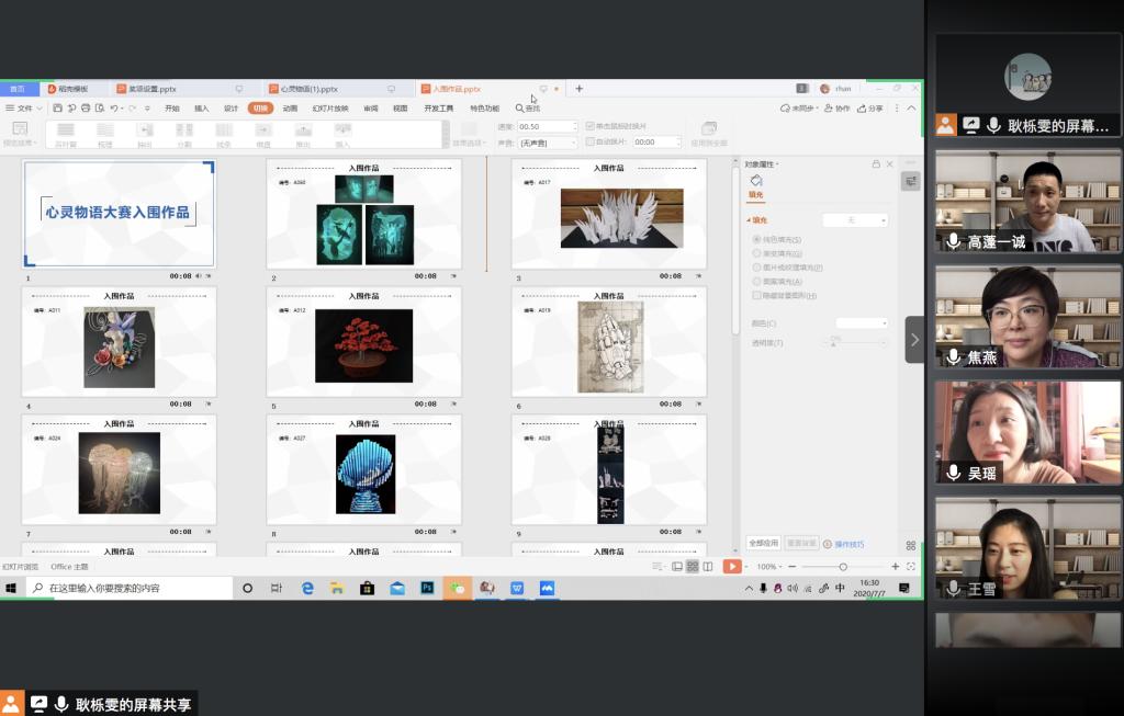 7月7日下午,由学生处心理健康中心主办,视觉传达设计学院团总支承办的“‘疫’路同行、心灵绽放”之心灵物语作品大赛评选活动通过腾讯视频会议的形式在线上顺利开展,担任本次大赛的评委有视觉传达设计学院专业课教师焦燕、高蓬、王雪、吴瑶。