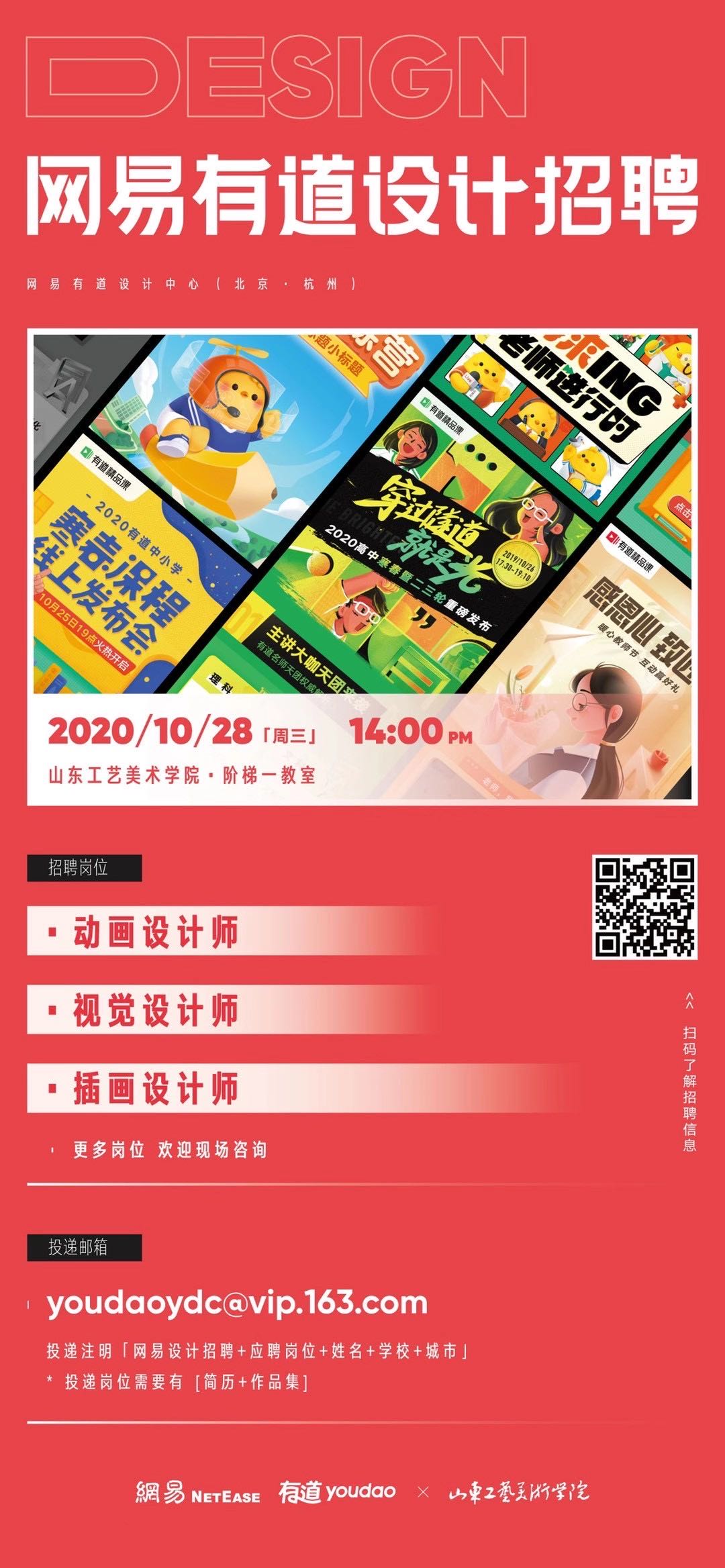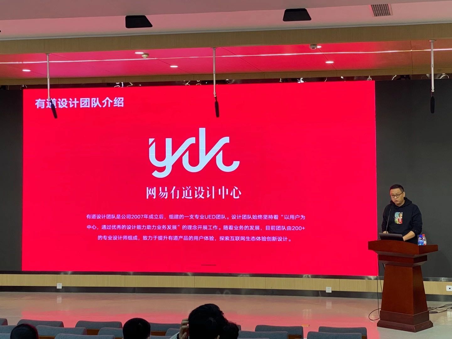 宣讲会现场,有道相关工作人员与同学们分享了有道设计中心的基本概况、设计中心目前的设计团队构成,分享了有道经典设计案例,并向同学们介绍了本年度校园招聘的岗位需求、应聘人员要求等。