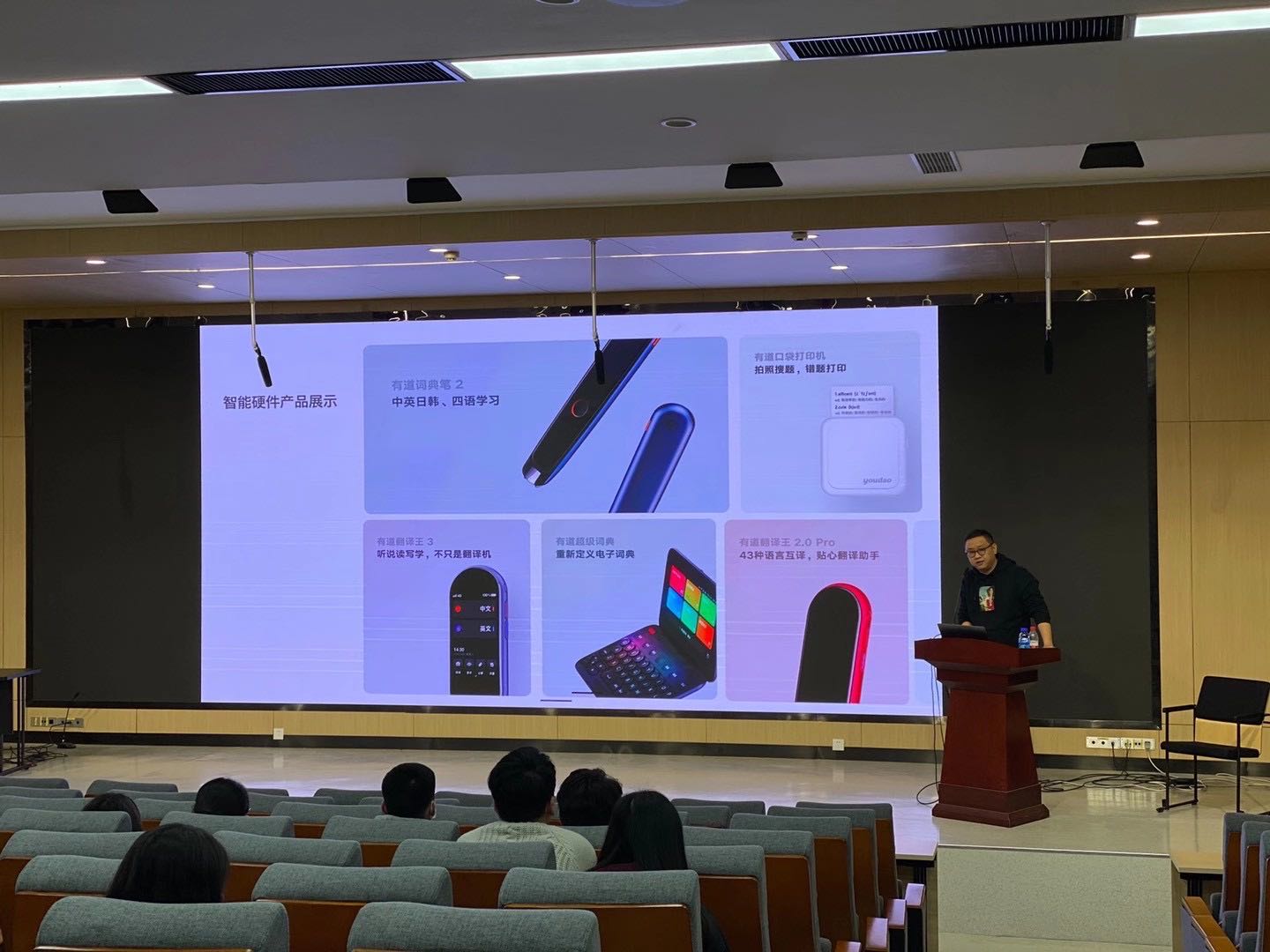 2020年10月28日,网易有道信息技术有限公司(北京)在永利官网阶梯一多媒体教室召开2020年度校园招聘宣讲会。网易有道设计总监王鹏、设计经理王为轩、硬件设计负责人刘翰伦在现场与同学们进行互动分享。