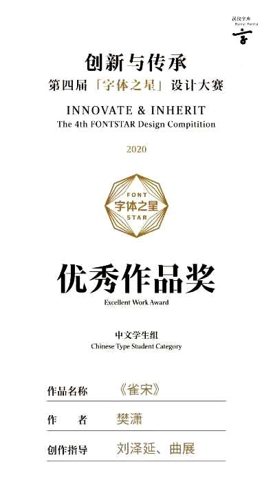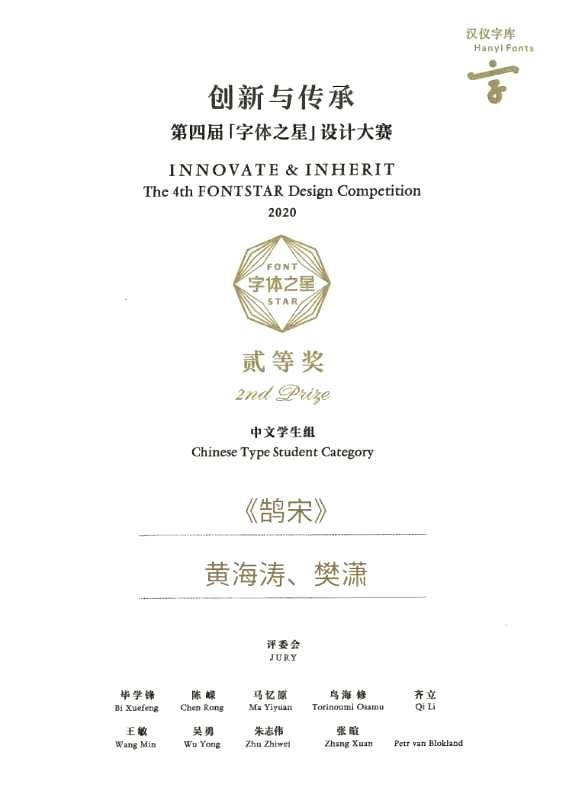 视觉传达设计学院第五工作室黄海涛、樊潇同学在刚刚结束的汉仪“第四届字体之星设计大赛”中喜获佳绩,其中黄海涛、樊潇设计的《鹄宋》体获得二等奖和评委奖(齐立评委);樊潇设计的《雀宋》体获得优秀奖。