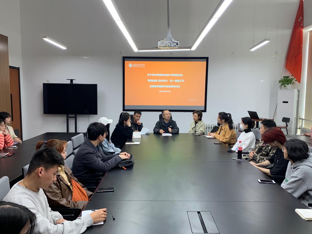 2021年3月31日中午,视觉传达设计学院党总支在办公楼三楼多媒体会议室召开“胜利法宝 复兴伟力”中国共产党统一战线工作主题宣传画创作学生骨干动员会。本次活动由辅导员陈瑶主持,视觉传达设计学院党总支书记吴焕文出席了会议并发表讲话,辅导员王敏、高畅、朱晓晨参加了此次会议。