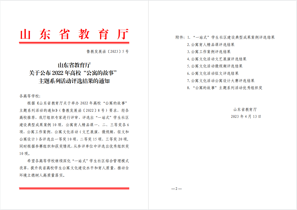 近日,山东省教育厅发布《关于公布2022年高校“公寓的故事”主题系列活动评选结果的公示》,学校党委学工部(处)推荐的视觉传达设计学院师生作品在公寓文化活动文艺展演评选中喜获一等奖一项、三等奖一项。