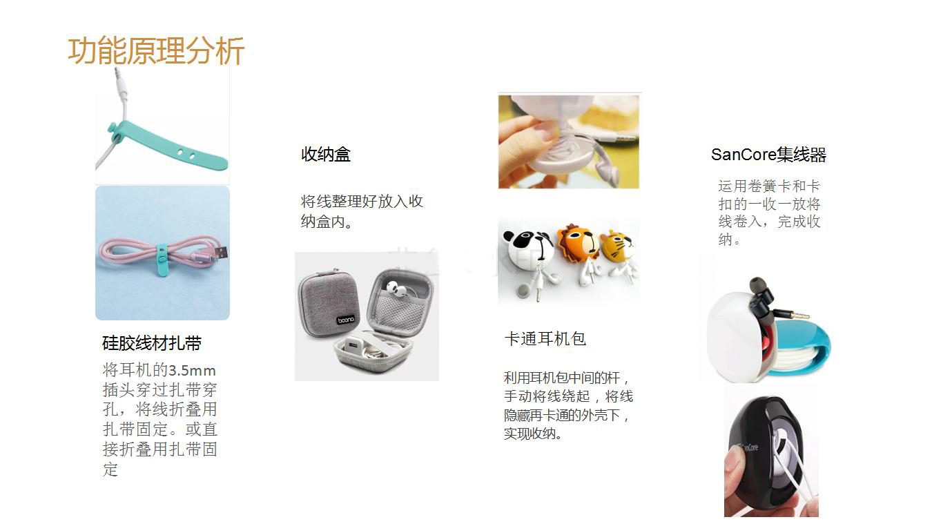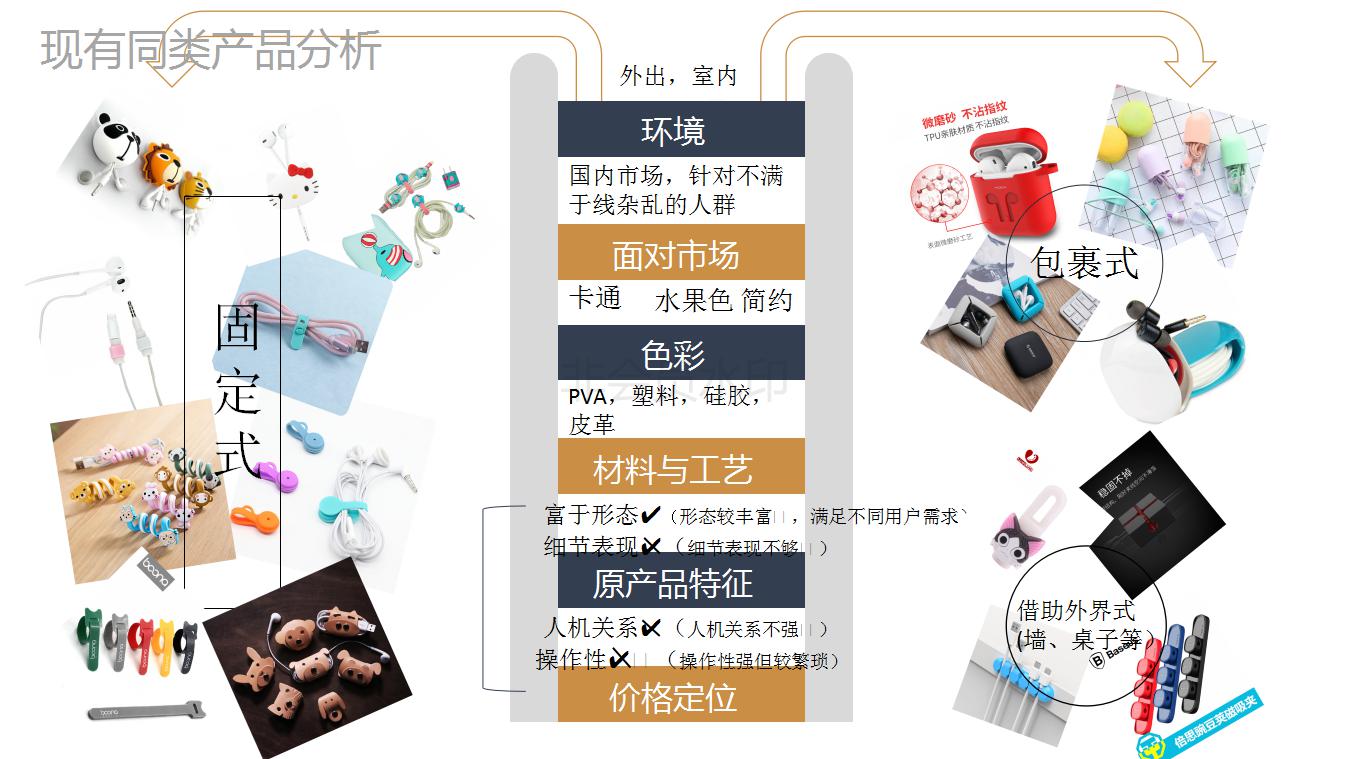充分地了解现今市场中不同品牌或造型风格的产品,并深入地研究、对比、学习产品的功能原理,是学习这一知识点的主要任务。通过归纳、梳理同类产品的造型语言,分析功能实现方式的优劣,可以预见该类产品的造型发展趋势以及功能原理发展水平;再结合上一知识点寻找到的用户人群与具体需求,便可提出相应的设计目标与定位。