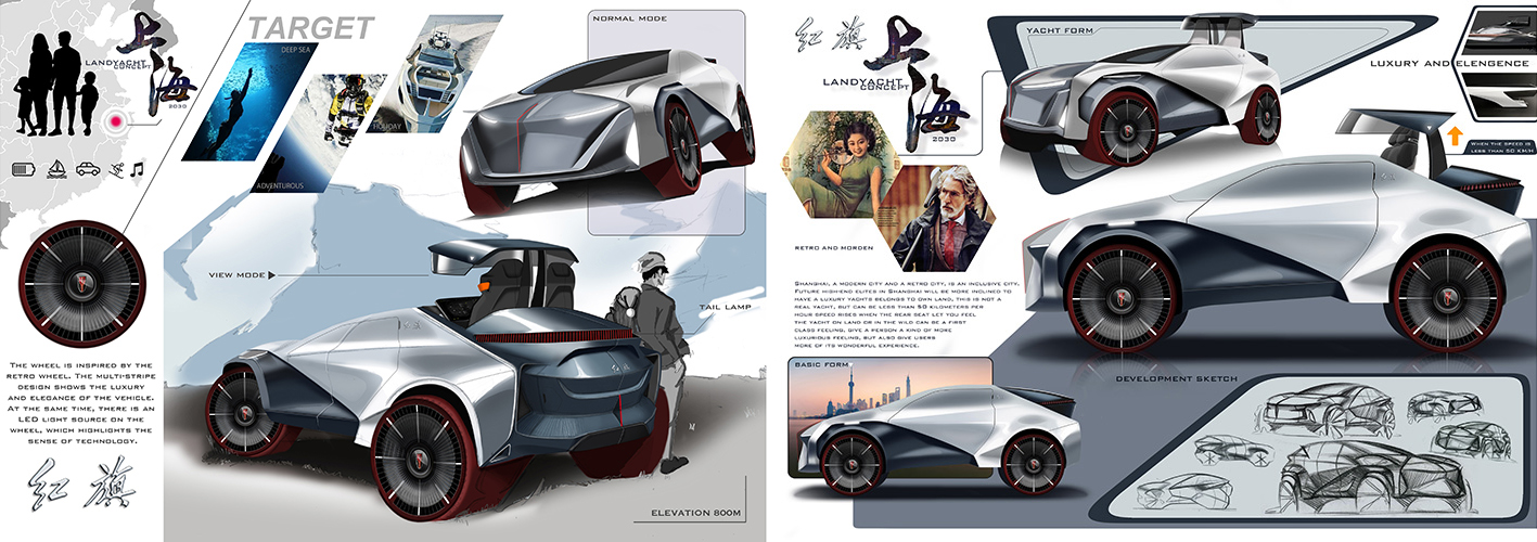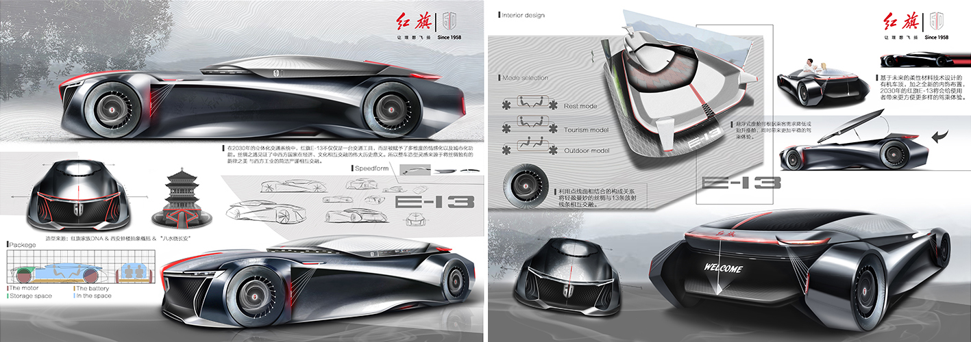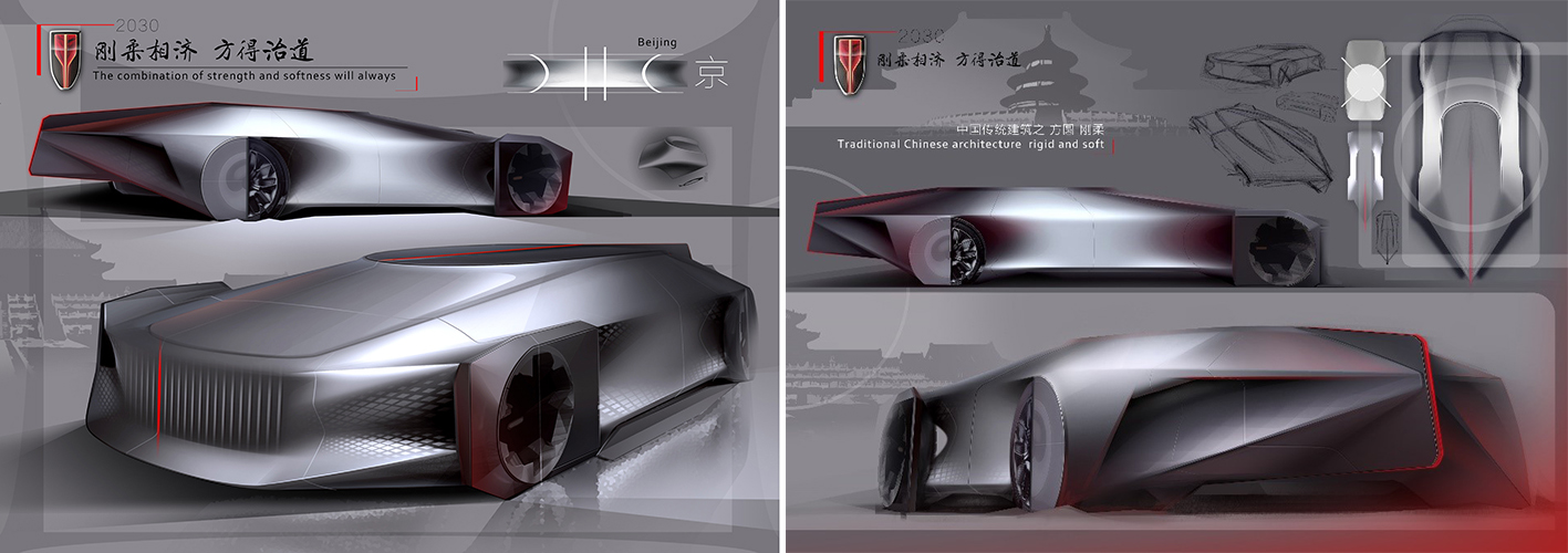 工业设计学院学生杨志鹏经过激烈角逐,入选决赛五强选手,以北京为创作城市,探索红旗汽车的新中式设计语言。设计提取中国传统建筑、器具造型元素,提出以“亘”为主题的概念汽车设计,塑造威仪、非攻、均衡的新中式概念汽车造型,作品获得评委的高度认可,最终获得设计挑战赛铜奖,成功签约一汽红旗造型设计院内饰设计部。学生刘峰连的作品“西安E-13概念车”以柔性材料体现丝绸韵律之美,学生徐耀的作品“上海ELEVATION BOOM概念车”以空间变形体现移动空间概念,两件作品获得大赛30强优秀奖。