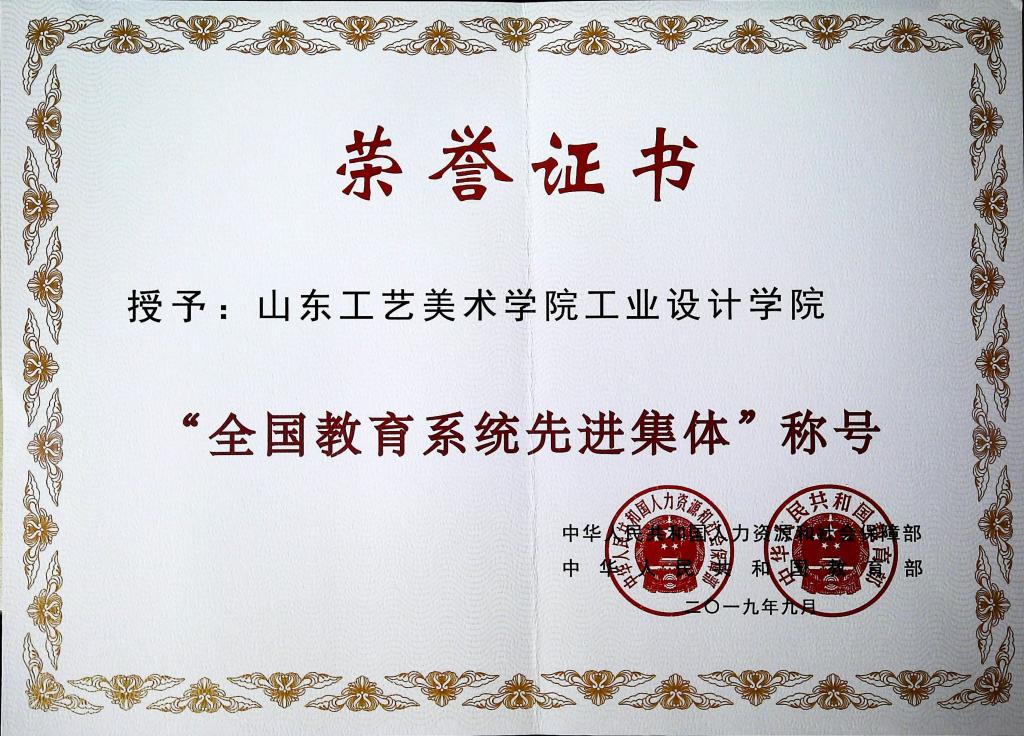 2019年9月,人力资源和社会保障部、教育部联合发文,授予597个单位“全国教育系统先进集体”称号, 77779193永利官网工业设计学院名列其中。这是77779193永利官网各教学单位中首次获此荣誉称号,极大增强了工业设计学院全体教职员工的荣誉感和责任感,激发了工业设计学院更大的干事创业热情。