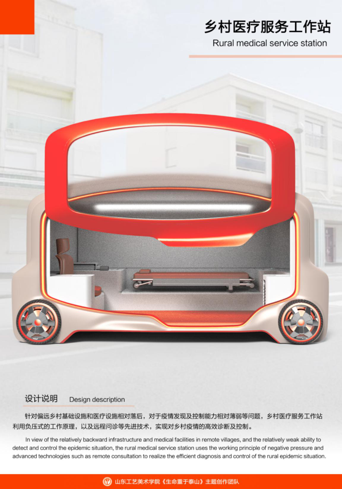 在设计初期,我参考了很多车辆的结构和造型,力求塑造更加简洁和亲和的外观,进行整体医疗系统的设计。工作站将专业诊疗服务深入到乡村中,改变了以往集中化医疗检测的模式。分散为多点检测、基本诊疗、集中隔离的防疫、疾控新体系。该体系在方便民众的同时,尤其在疫情防控期间,可以极大的避免人群的大批次流动与聚集。此外,防护、隔离、消毒是阻断病毒传播的基本途径,通过有针对性的产品设计使隔离消毒更加便捷,可有效地遏制病毒,并降低防护隔离的社会成本。考虑到工作站内部构造的可行性以及科学技术支持等因素,因此服务工作站内可搭载相关检测与诊疗仪器,并配有网络诊疗设备、基础药物。同时,还设置了负压式新风系统,可实现车内通过负压式的工作原理来控制空气流动从而抑制病毒传播。
