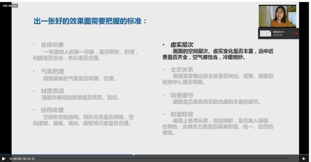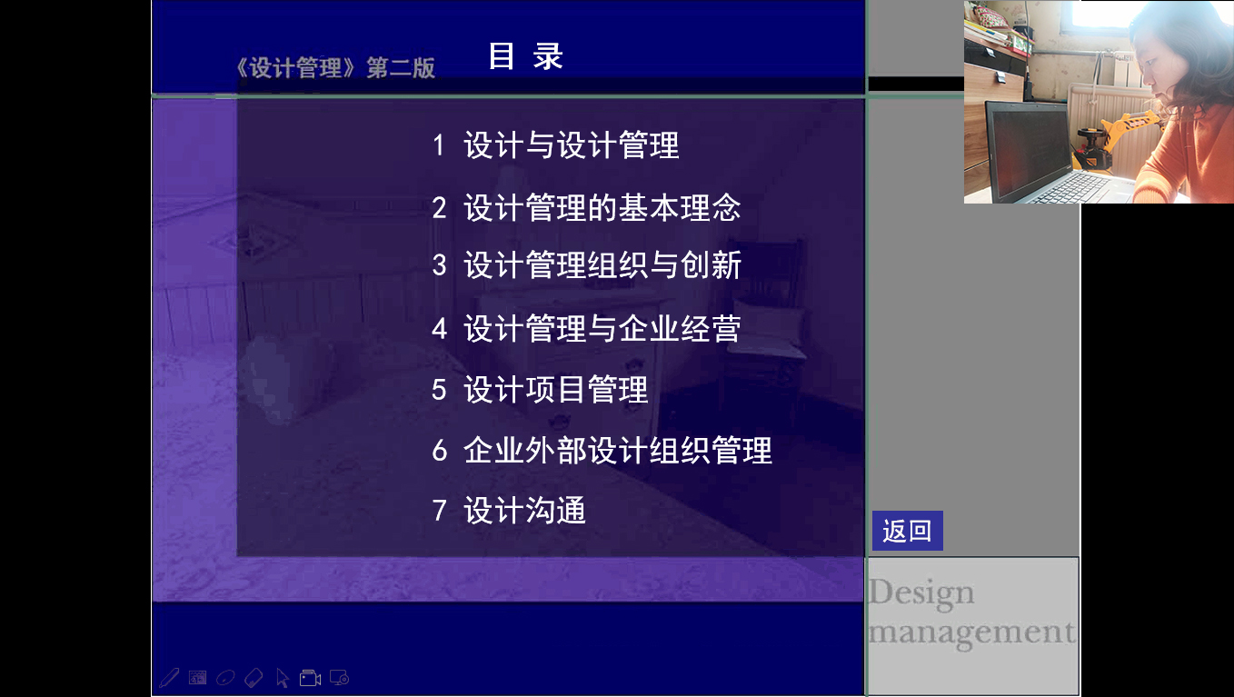 设计管理课程是一门专业基础理论课,任课教师针对大量讲授的内容,采用瞩目app视频直播、PPT+音频直播的形式,利用瞩目app所聘会议+屏幕分享、长江雨课堂语音直播+PPT共享,配合具体实例,讲解设计师与管理者在文化背景上的差异,分析设计公司及设计部门在日常管理中设计师与管理者的不同看法。讲课思路清晰,信息量适中,教学过程安排合理,授课内容重点突出。