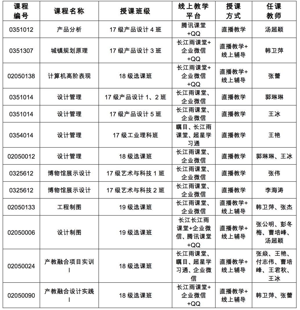 由于课程需求不同,工业设计学院参与线上教学的教师由课程特点和学生学习方式出发,选定以长江雨课堂为主,多种教学平台为辅的线上教学方式,并依据课程要求制定了多种线上教学备选方案,以应对教学过程当中出现的教学平台或网络异常的情况。工业设计学院第一周共开设课程(按课程编号)11门,在线教学覆盖率达到100%。工业设计学院第一周线上教学各门课程的线上教学平台及授课方式见下表: