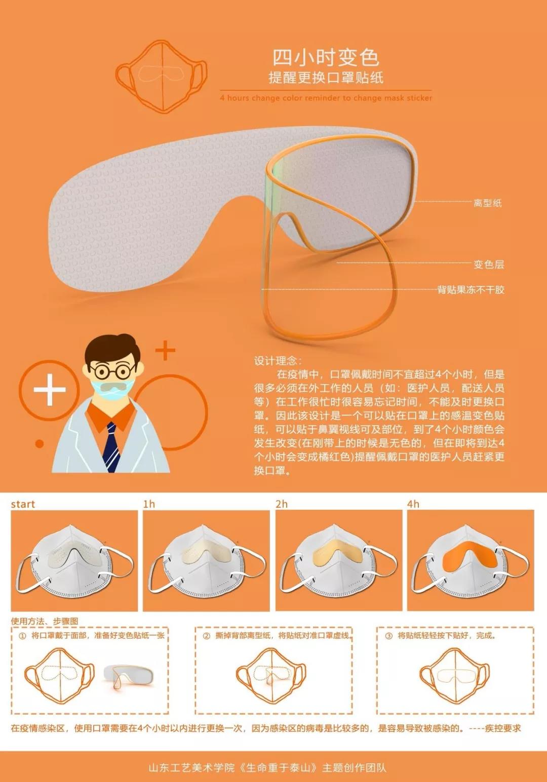 疫情防控期间,口罩是最好的预防病毒传染武器。但口罩佩戴时间一般不宜超过4个小时,很多必须在外工作的人员(如医护人员、配送人员等)在工作忙碌时很容易忘记时间,不能及时更换口罩。该设计主体为贴在口罩上的感温变色贴纸,可以贴于鼻翼视线可及部位,到4个小时颜色会发生改变(由无色变成橘红色),提醒佩戴口罩的医护人员及时更换口罩。
