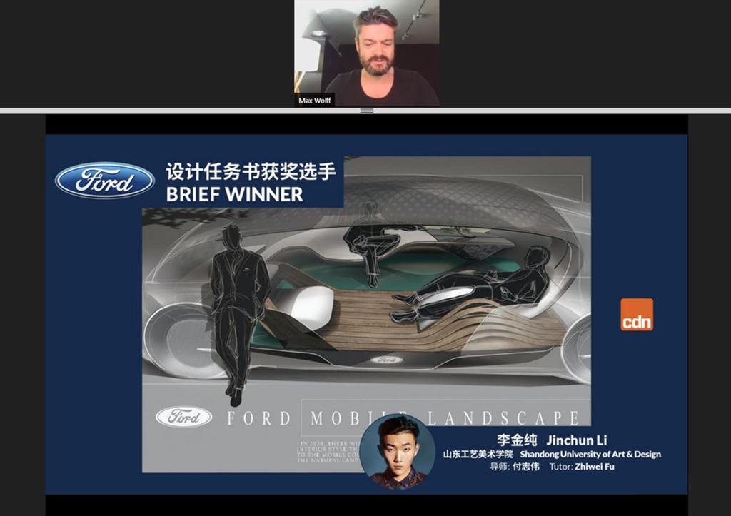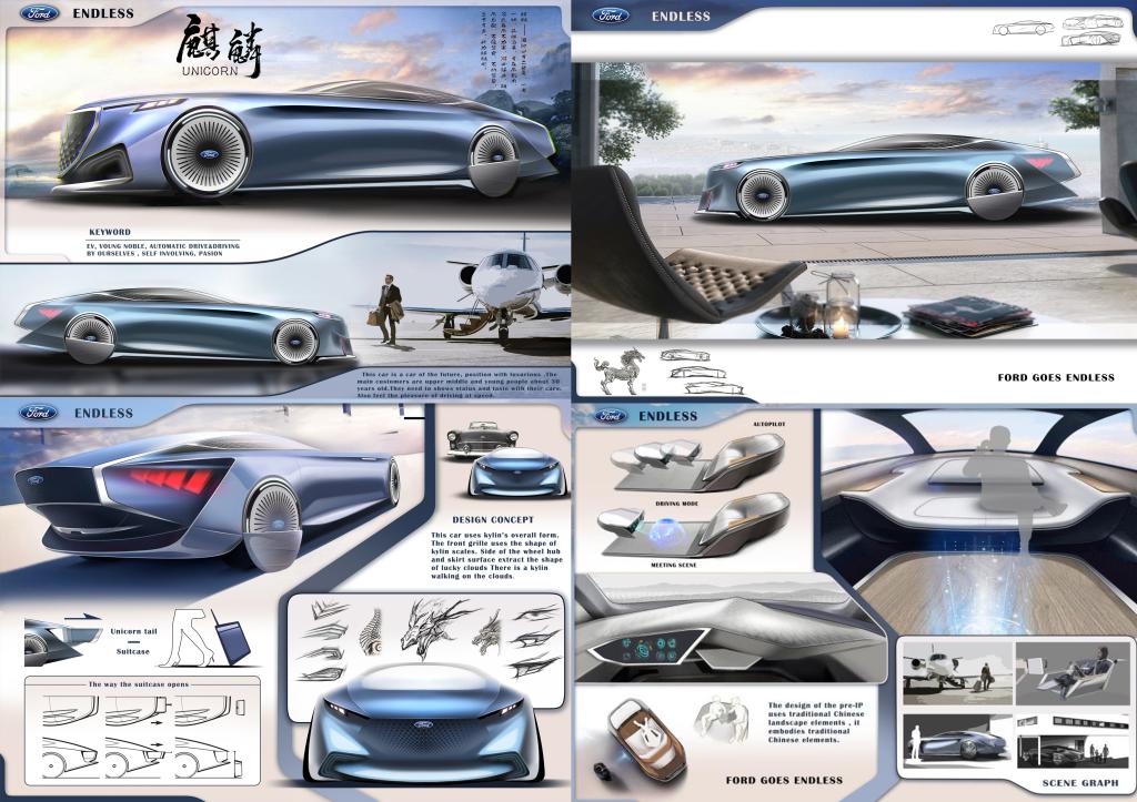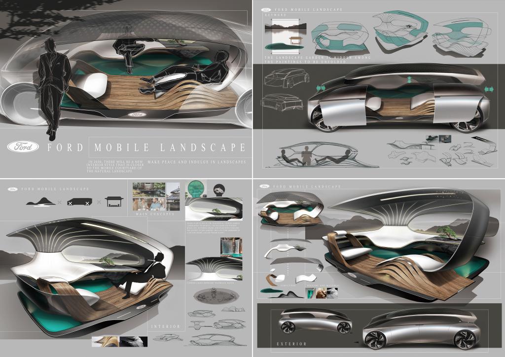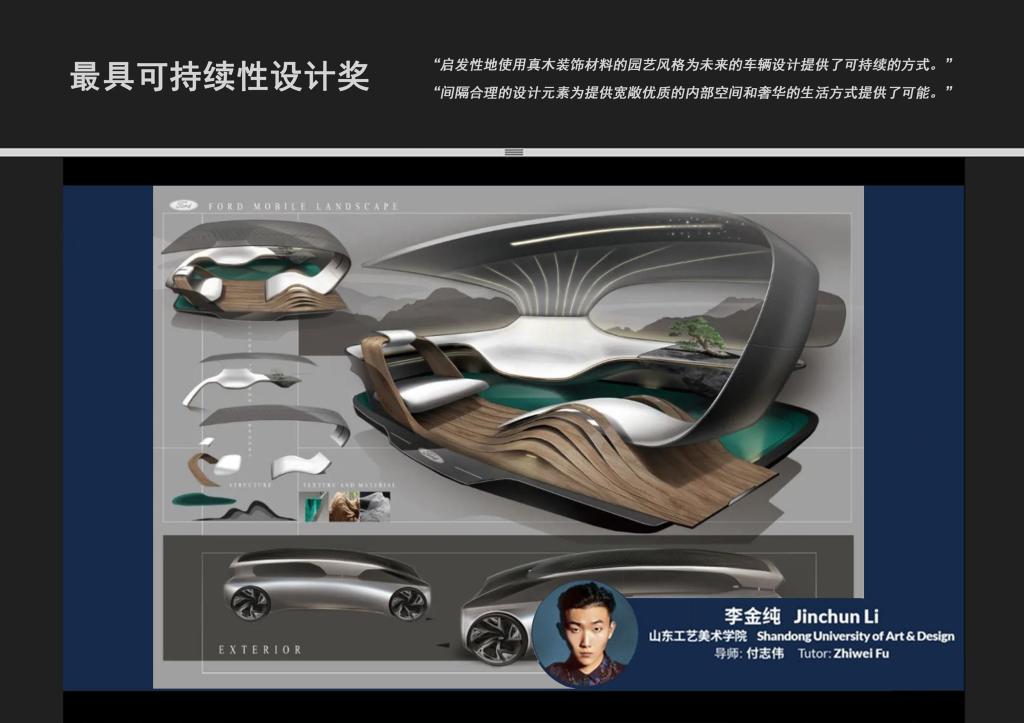 李金纯同学的参赛作品《FordMobileLandscape》,以自动驾驶时代的“移动山水庭院”为设计理念,座舱内利用各种材料和形态,使乘客仿佛置身于山水之间,更加亲近自然的氛围也使行驶中车内的体验更加惬意别致;而旅行停泊时车内和外界能够更好地融合。在形态上,柔和而富有层次的线条和曲面构成了主要的设计语言,形态也同样来自对高山落水的抽象提炼。对于中式设计语言探索与独特的内饰材料搭配相得益彰,共同诠释了“移动山水庭院”的概念。作品获得评委组高度认可,最终获得福特企业设计奖与最具可持续性设计奖。