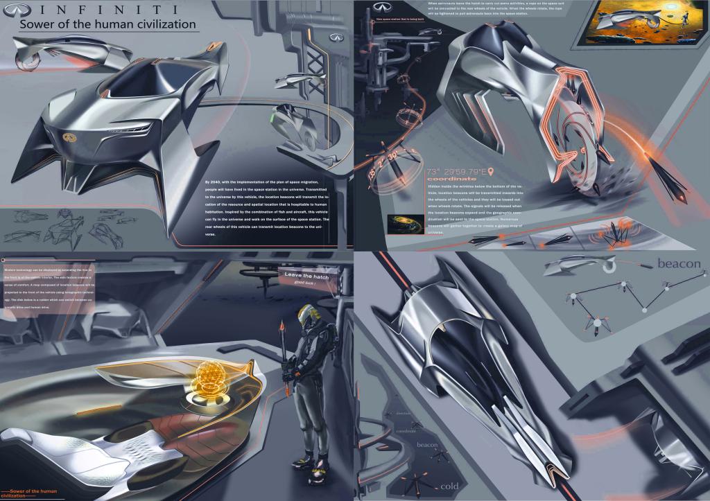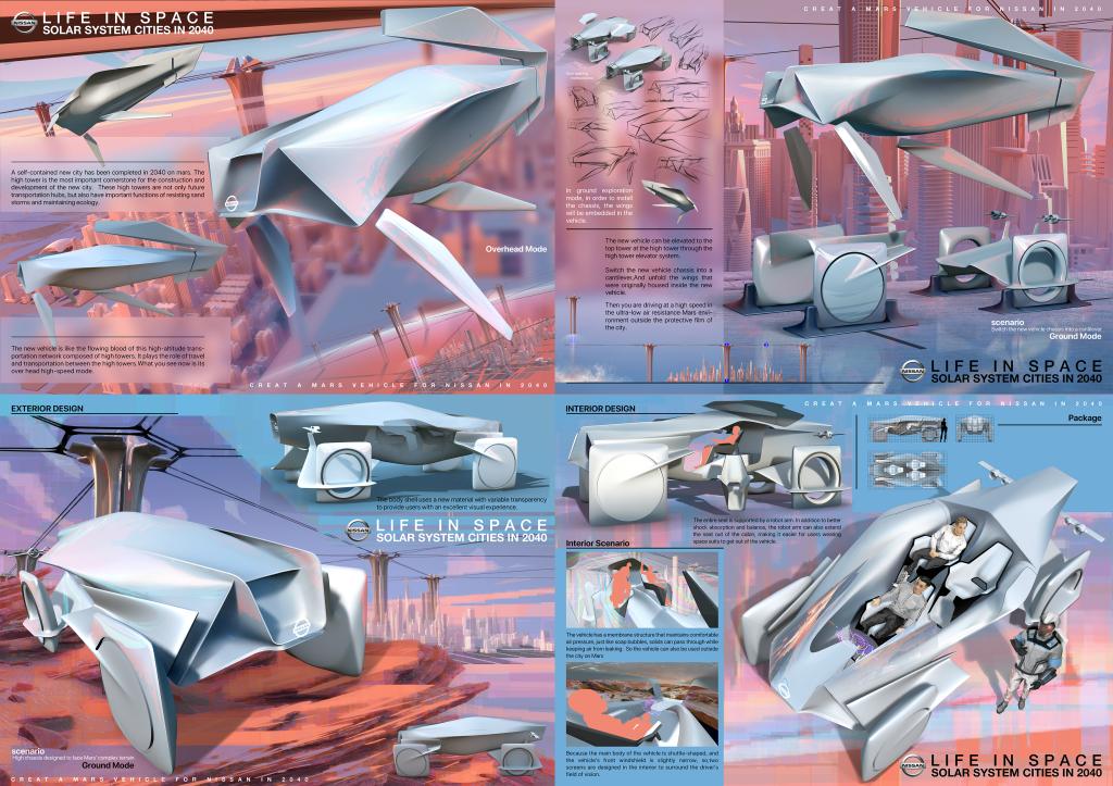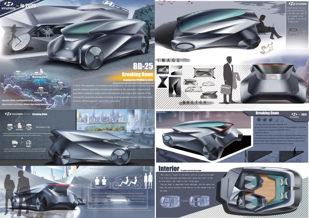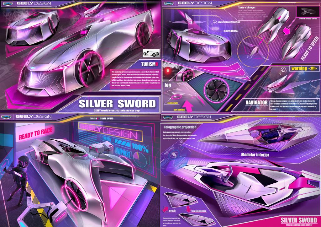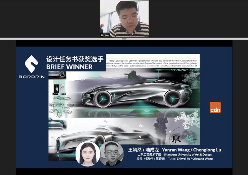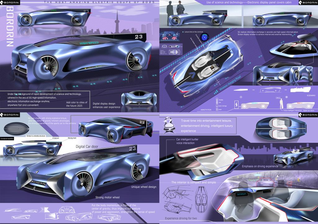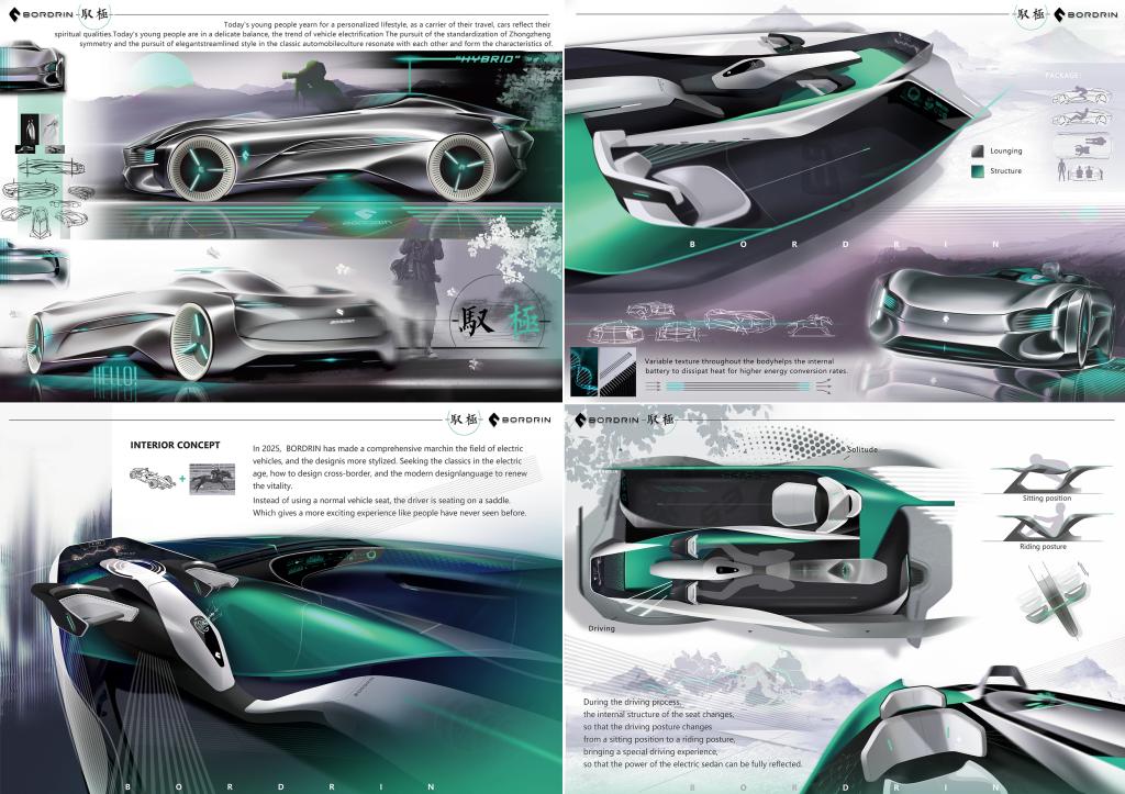 王嫣然、陆成龙同学的参赛作品《驭极概念博郡轿跑车》,以轿跑车型基础姿态为设计基础,根据电动车的功能结构进行造型创新改变车体姿态,以城市青年为人群定位,以个性化与融合化的造型设计、贴合电动车动力结构的车身特性为切入点,将电动车的电池冷却结构作为设计主元素融合车体,打破现有车型内部功能结构与外部设计造型的分割,创新结构布局,满足目标用户多样化的专属个性化驾乘需求,作品获得评委组认可,最终获得博郡企业设计奖。