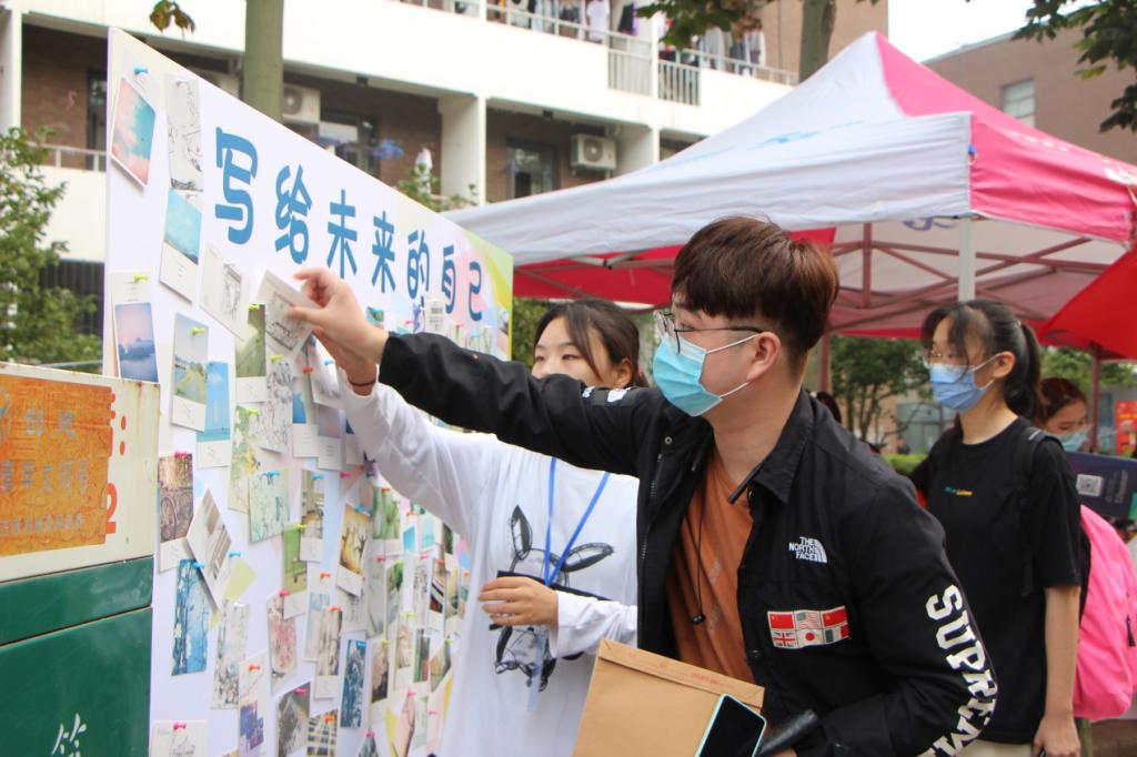 除了热情周到的服务,工业设计学院还为新生专门印制了《新生手册》,内容包含了“报到须知”、“专业介绍”、“校园文化”、“游玩攻略”及“防疫知识”五个部分,为初来乍到的新同学提供了学习、生活、防疫等全方位的详细指南。同时,在迎新现场开展“写给未来的自己”创意活动, 200余张明信片组成一面展板墙,每一位新生完成报到手续后可挑选一张自己喜欢的明信片,写下对未来的寄语并投入邮箱,这一张张承载着初心和期望的明信片将在其毕业之际重新回到个人手中,那时“未来”的自己再回望,将看到是否完成了当下的期许,意在提醒同学们不论走在人生的哪个阶段,都要时刻“不忘初心”。形式多样的活动使新生充分感受到了丰富多彩的校园文化,更快地帮助新同学融入到了大学生活。