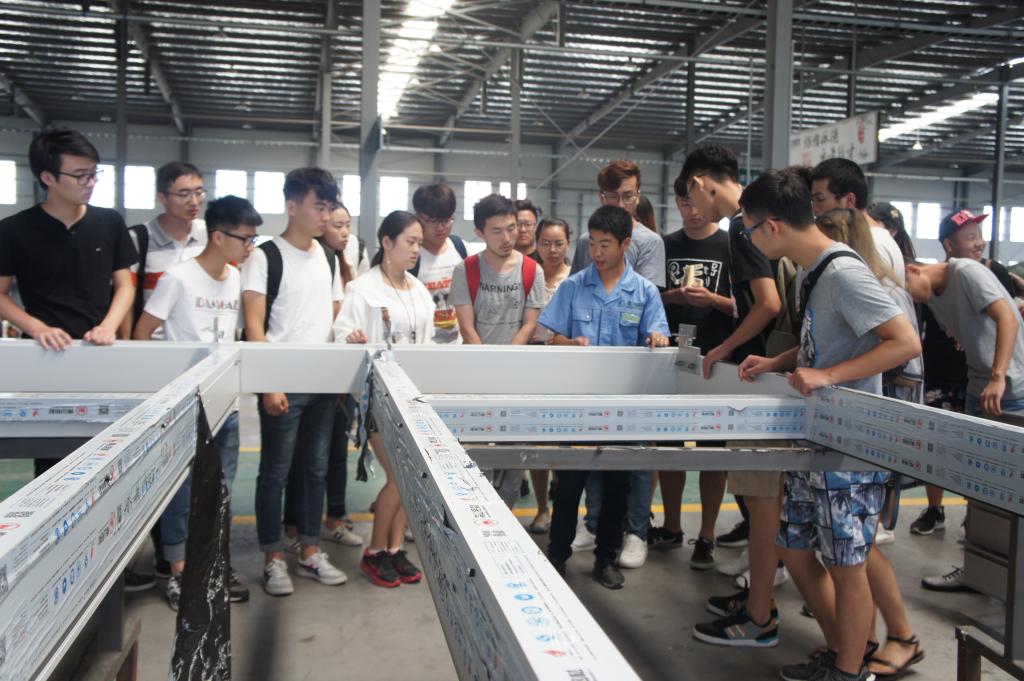 德才装饰股份有限公司人力资源谢天翔经理带同学们到青岛德才高科新材料有限公司考察。青岛德才高科新材料有限公司位于青岛胶州市李哥庄镇,占地300余亩,通过引进德国、意大利等先进生产线,进行幕墙、高档门窗、节能环保新型材料的研发与生产,拥有世界一流的机械生产设备,为国内顶级配置,是中国住建部授予的绿色环保生产研发基地之一。 德才高科一号车间主任胡神林带领同学们参观了生产线,为同学们讲解了玻璃幕墙、铝合金门窗的生产过程,如型材的规格、样式,加工中用到的机械,以及型材组合工艺;幕墙中玻璃的种类,玻璃与型材的结合工艺等等。车间参观结束后,胡主任在会议室与同学们交流了玻璃幕墙和铝合金门窗施工工艺。人力资源谢天翔经理针对同学们的疑惑,展开了关于眼界与目标的演讲,根据多年的人资工作观察,总结了优秀设计师的基本素养与品质。同时谢经理还为同学们介绍了与设计相关职业的情况,为同学们提供了更广阔的职业选择。