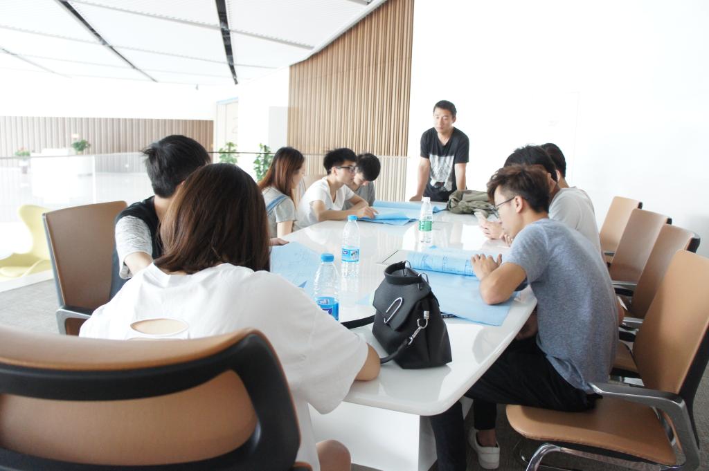 德才装饰股份有限公司总工程师张勇带领同学们考察海尔新品发布中心,这是一处刚刚完工的项目。公司贴心的为同学们准备了施工图纸,方便同学们对照学习。一开始张总介绍了整个建筑的空间布局及错层设计这个设计亮点,随后带领同学们进行参观并实地讲解,并对于异性天花吊顶,玻璃幕墙的施工做了重点介绍。在进入整个建筑的核心----多功能报告厅时,张总又对其内部空间设计,座椅摆放,机器设备的使用对大家进行知识上的补充,同学们听得非常认真,收益颇深。随着整个参观的深入,我们来到了二层美客工作中心,在这里,张总让大家短暂休息,分小组讨论施工图纸,大家聚在一起相互交流,本校的带队老师在一旁进行指导,同样收获了许多的知识。在图纸讨论结束后,张总又回答了同学们提出的一些问题并在随后的参观中对照实体结构对同学们进行了一一解答。