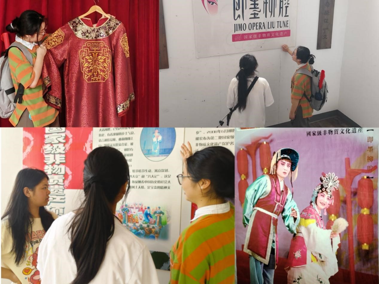 即墨区柳腔艺术中心与青岛市胶东非物质文化遗产博物馆作为传播柳腔文化的前沿阵地承载着丰富的历史记忆与艺术财富。团队成员通过参观展厅、表演戏台和聆听讲解员的解说,明晰了即墨柳腔的历史起源和发展过程。在参观排练场地时,团队成员深切感受到即墨柳腔的艺术魅力和深厚内涵,也为团队制作宣传纪录片起到引导性作用。