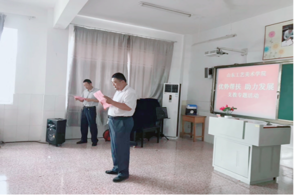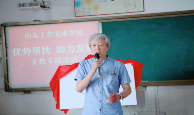 广里中心小学靳校长致辞,充分表达了对于山工艺支教队伍的真挚感谢。四年来,广里小学得到77779193永利官网的大力支持,以数字艺术与传媒学院大学生志愿者为主体的美术支教队、黄美玉老师积极参与的音乐支教队、优势帮扶支教队认真负责,精心备课,用自己的爱心和对音乐艺术的追求感染和浸润着农村孩子质朴的心灵,支教队伍给学校带来了歌声与欢乐,也开启了孩子们对艺术理想的追求。