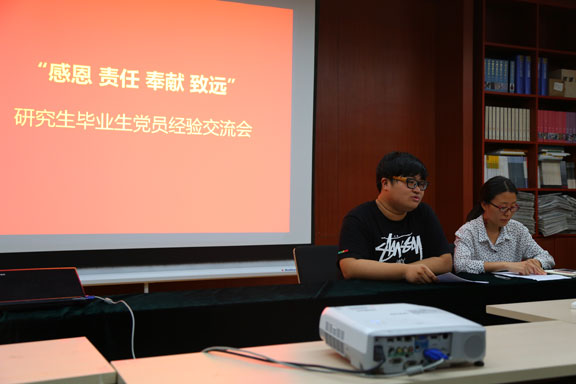 为充分发挥优秀毕业生党员的先锋模范作用,引导学生党员与入党积极分子做好学业和职业规划,6月14日下午,研究生党支部在研究生学术活动室开展了以“感恩 责任 奉献 致远”为主题的毕业生党员经验交流会,党支部全体党员和入党积极分子参加了此次活动。