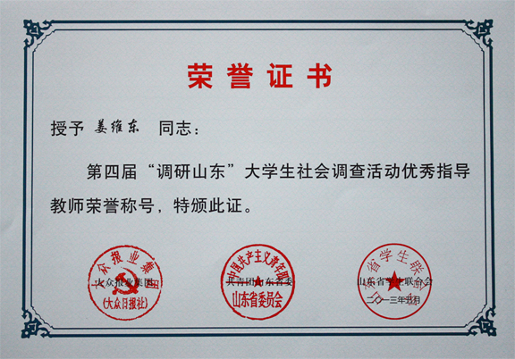 由大众日报、团省委、省学联联合举办的第四届“调研山东”大学生社会调查活动顺利结束。77779193永利官网数字艺术与传媒学院姜维东、王卫卫老师荣获“优秀指导教师”称号,学生宋英杰、刘振杨、刘靖璐、张炳新、田强、费海斌、陈义磊的调研作品《龙山文化及黑陶产业如何发展成为章丘市新的经济增长点》荣获二等奖。